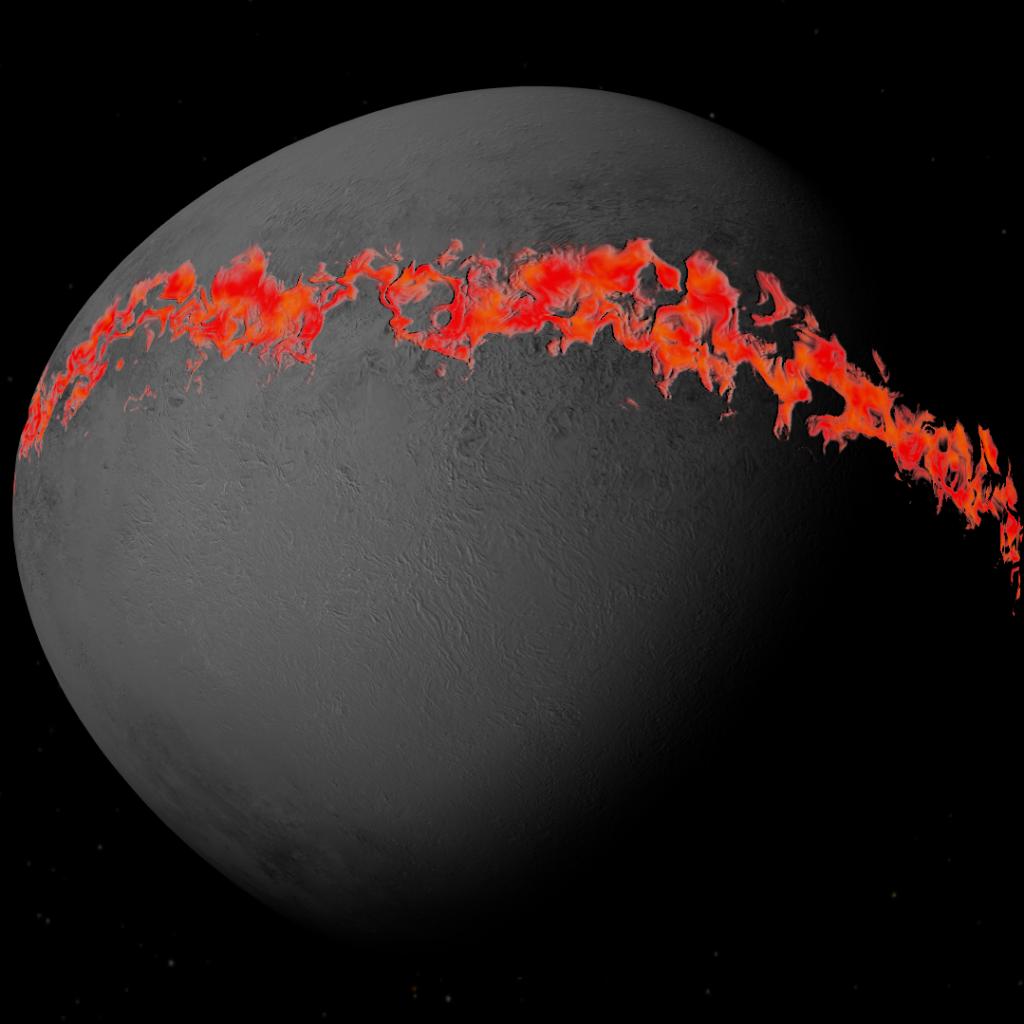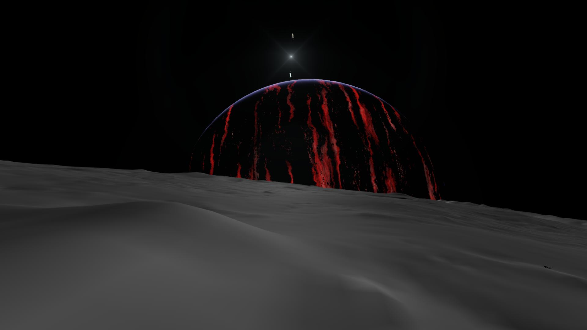 The first of the two moons of Dommaraeas, Drallastus is a small, rocky moon being destroyed by the planet. It was not always like this, however. Lacedor, the second and furthest moon of the Dommari System, orbited much farther out than Drallastus. Due to the immense gravity of the blackholes, the planet and the neighboring moon Drallastus, its orbit was destabilized and collided with Dommaraeas. This created a small ring of debris around Dommaraeas that was swiftly eroded by the wind and radiation from the two blackholes. The destabilization of Lacedor's orbit affected Drallastus' orbit, placing it in a small, slightly eccentric orbit above the Roche Limit of Dommaraeas. Due to the proximity to the planet, Drallastus is being stretched and pulled to its limits, with the mantle being exposed around the equator.