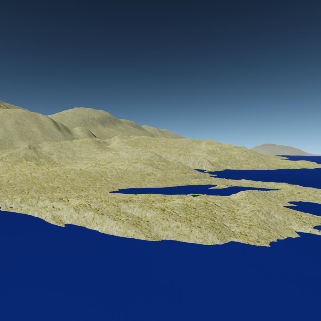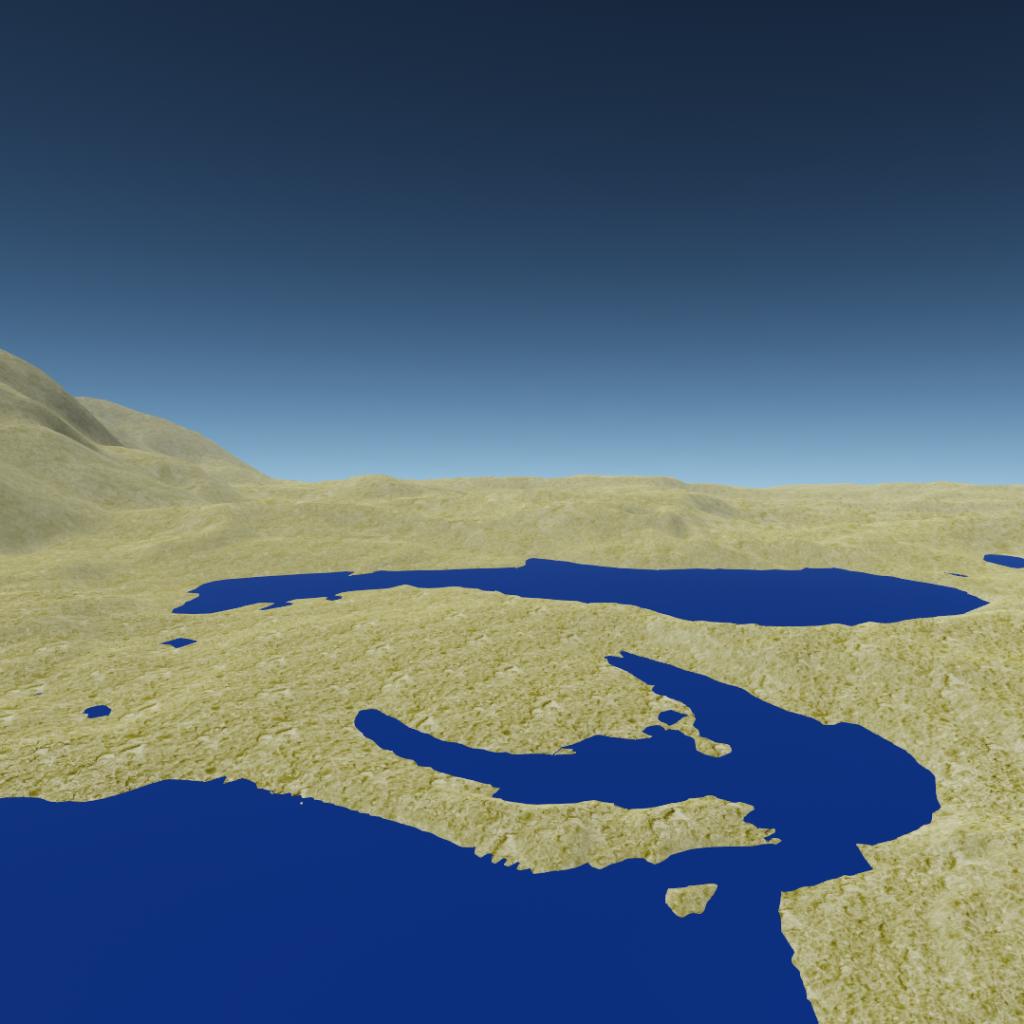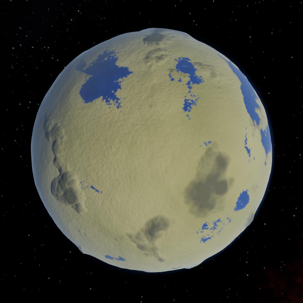 A moon warmed heavily by tidal heating. The result is a desert world with lakes of water scattered throughout, a rare example of an oasis planet.