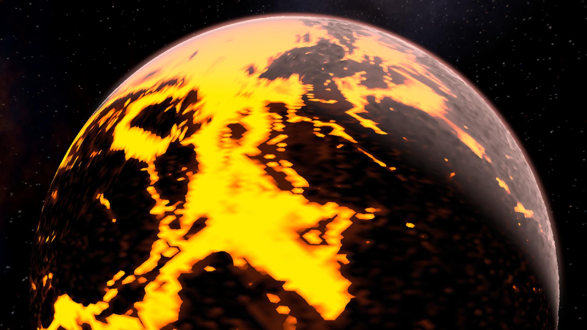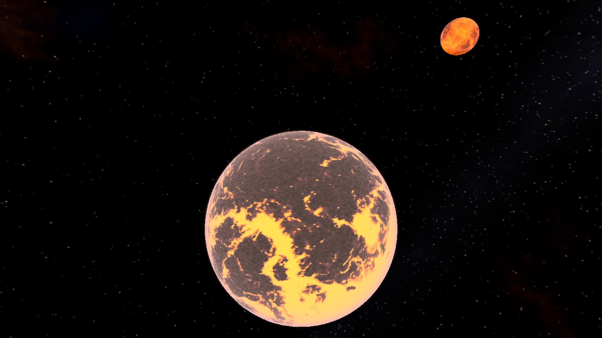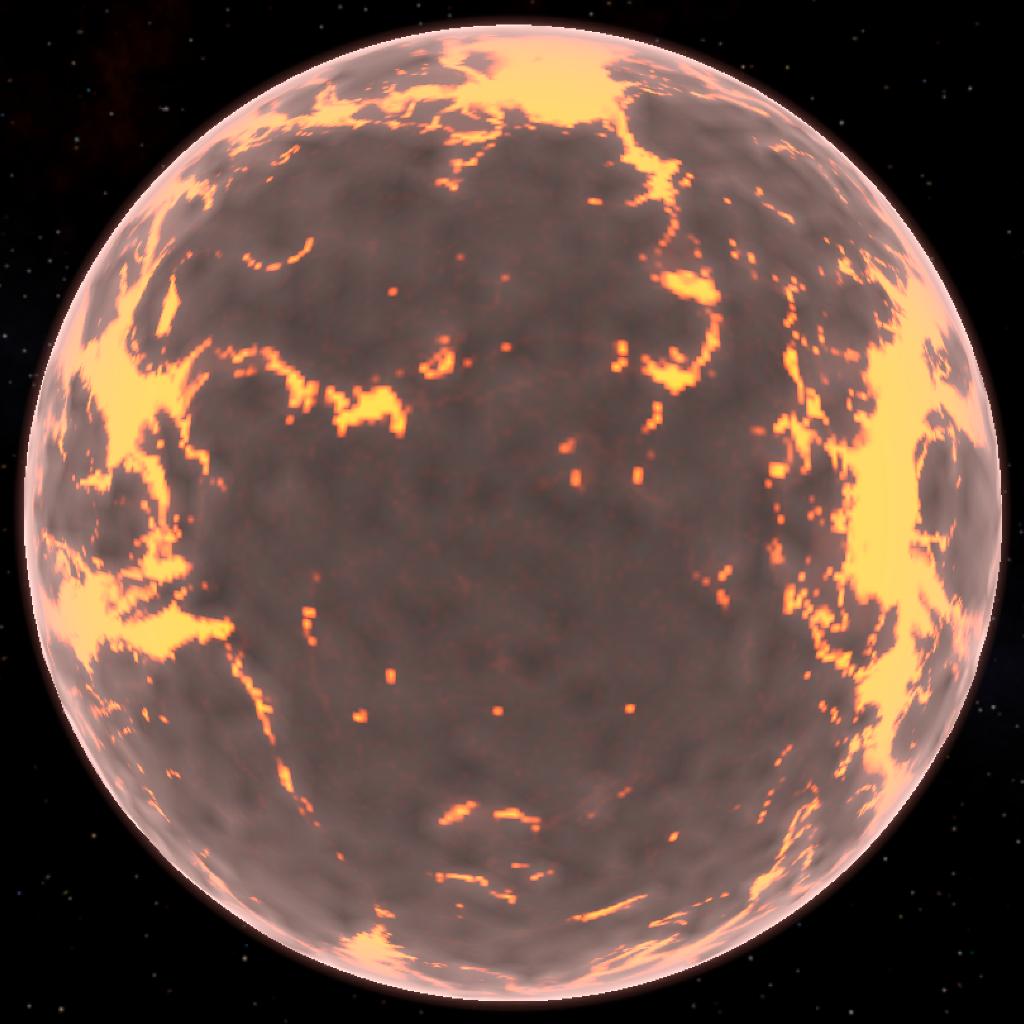 A magmatic planet with high geothermal and tectonic activity and a toxic atmosphere, covered in oceans of liquid lava and young continents. It's orbited by it's moon Valkra wich Is nearing its roche limit further heating the already hot planet.
