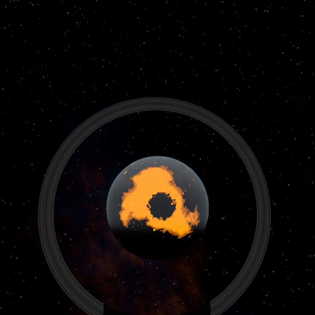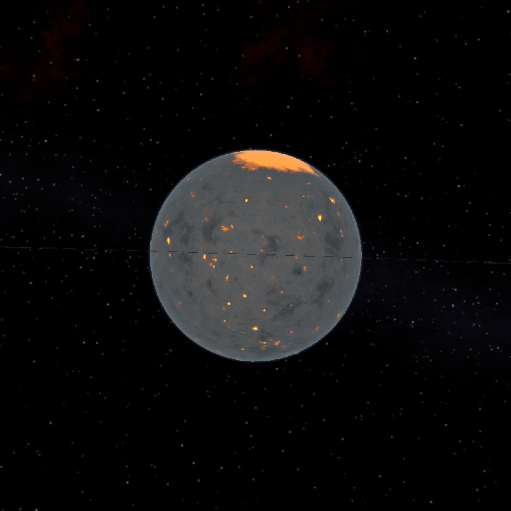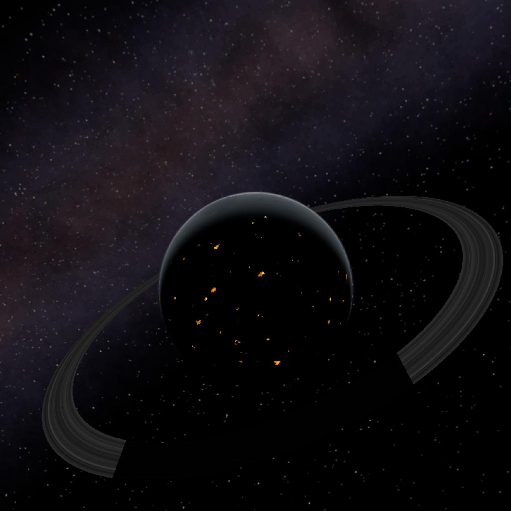 A dark grey planet with dark dust rings and covered in craters and volcanoes. The high tectonic and volcanic activity cause frequent earthquakes and volcanic eruptions. This activity has been reshaling the planet for a long time with huge now extinct volcanoes aswell as fresh lava lakes and younger volcanoes. A notable feature of the planet is the large lava ocean at the north pole where a dark volcanic plateau rises up creating something that resembles an eye from space. The atmosphere is thin and is still forming. This Is the third planet of the Geneos system and looks like a piece of charcoal on fire.