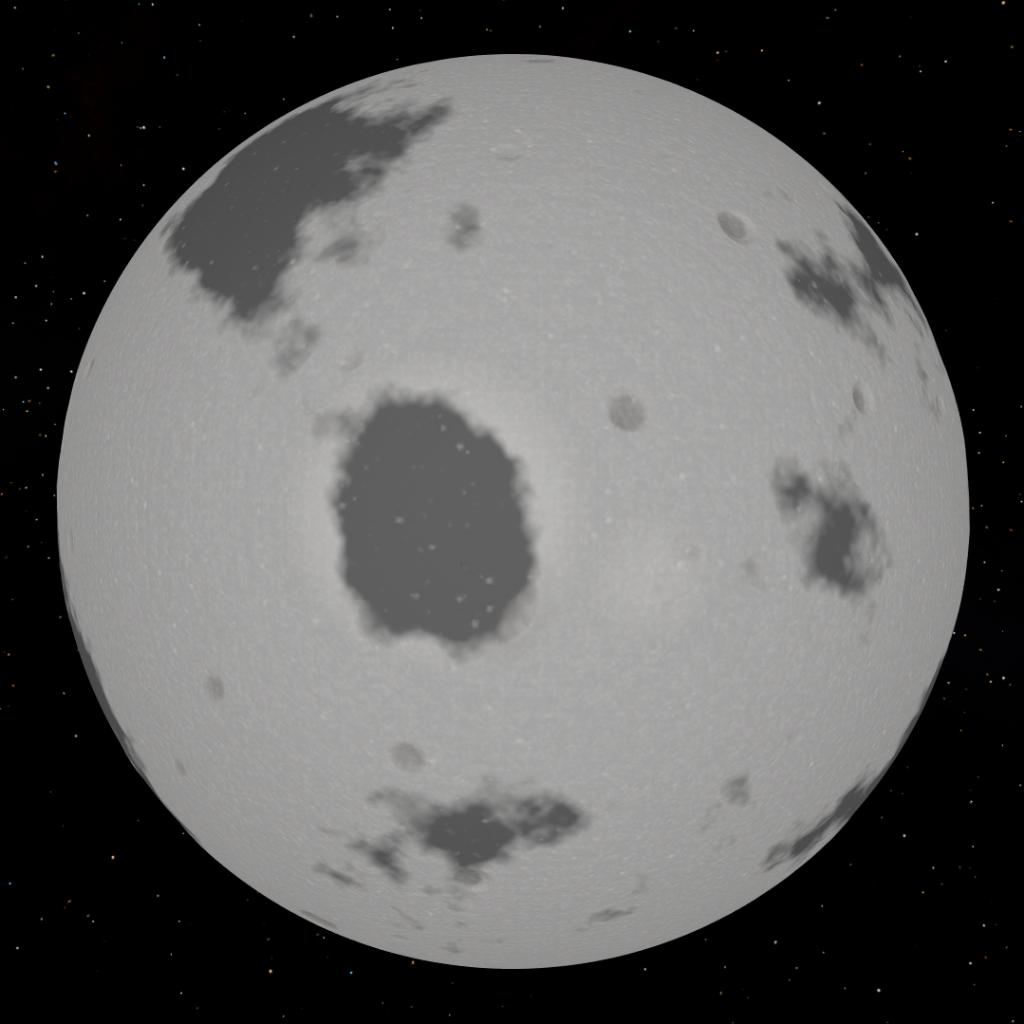 A rocky moon covered in dust and large craters, with some signs of volcanic activity.