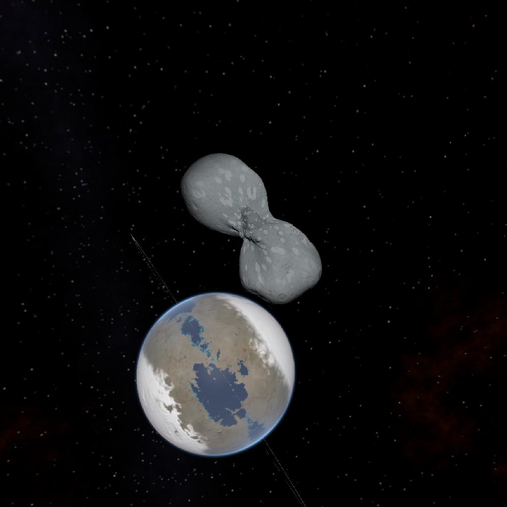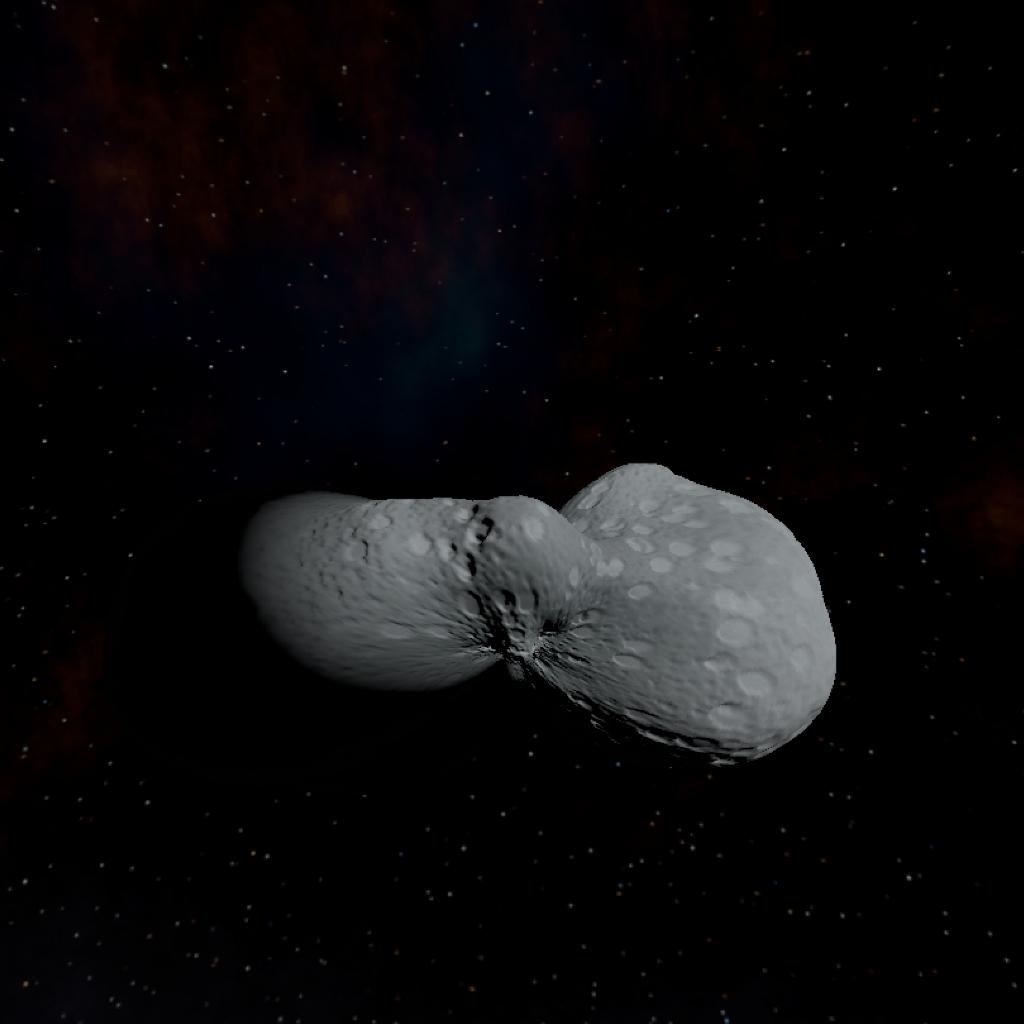 A large elongated asteroid with a very strange shape, covered in craters. It's one of the moons in orbit around Impelaa.It Is formed by two lobes wich were actually two separate moons that collided and fused due to the heat.