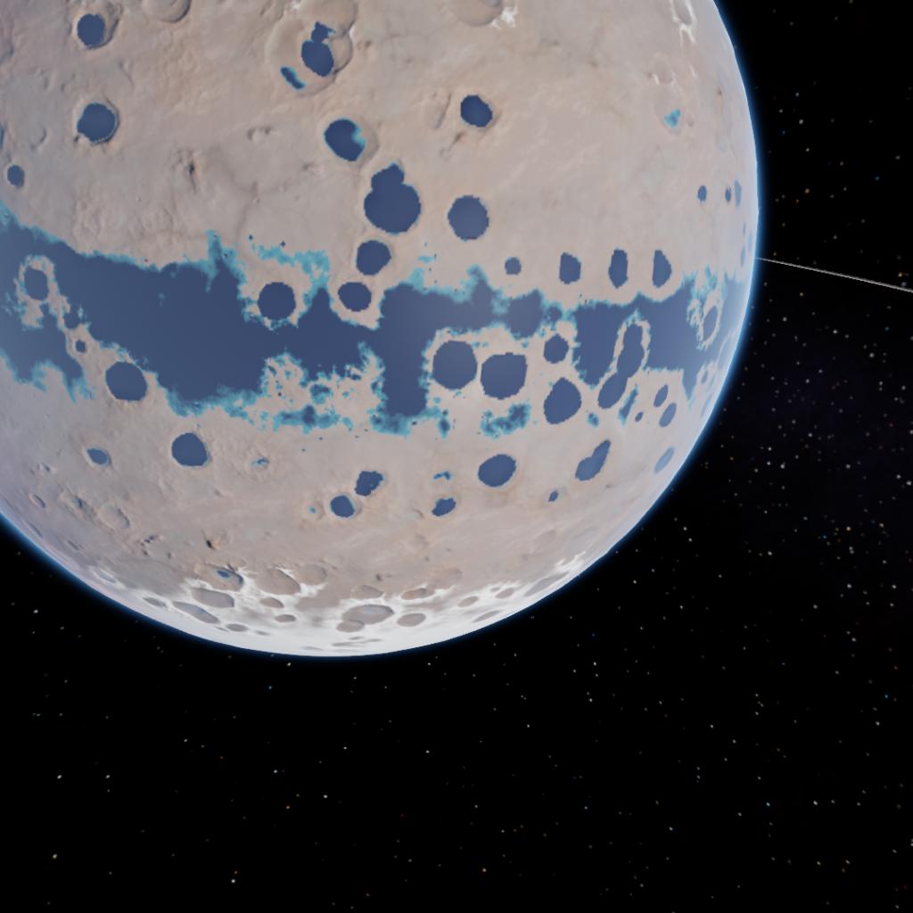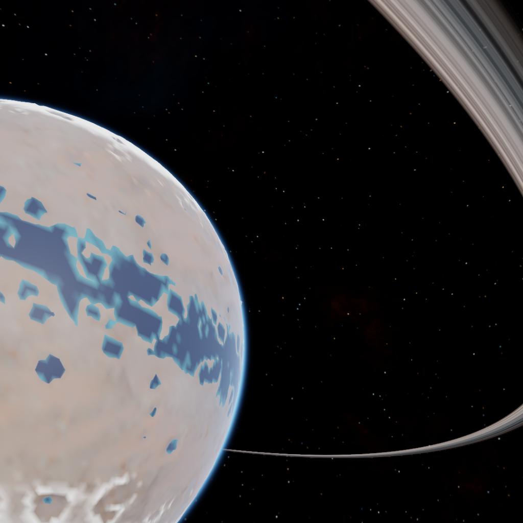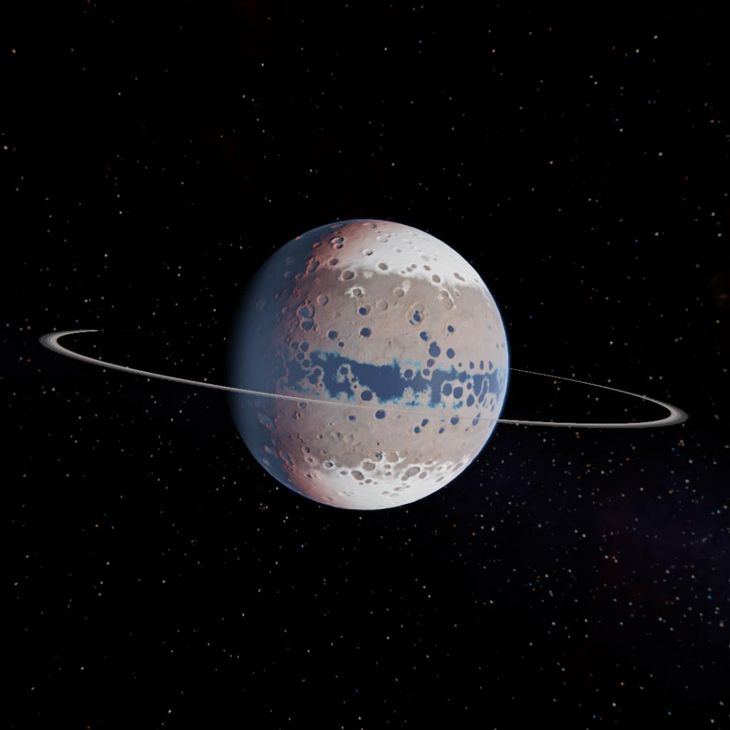 A rare Young-Earth body trapped in the Juno-Sergeaa L2 point, being in a constant partial eclipse. It has strange rings, many massive craters, a global ocean at the equator, and abnormally massive polar regions that are not covered in snow, rather white sand. This moon is a very popular tourism body in the Juno System. As a result, the droods have built a small base here. It has an atmosphere that supports life, though it is slightly warm.
