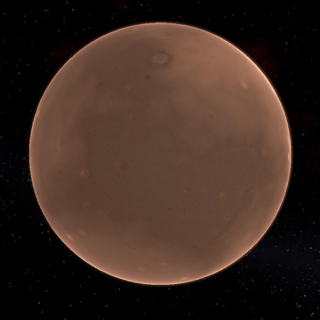 A reddish rocky moon with an atmosphere, covered in craters, volcanoes and large valles. It's the largest moon of Trilos