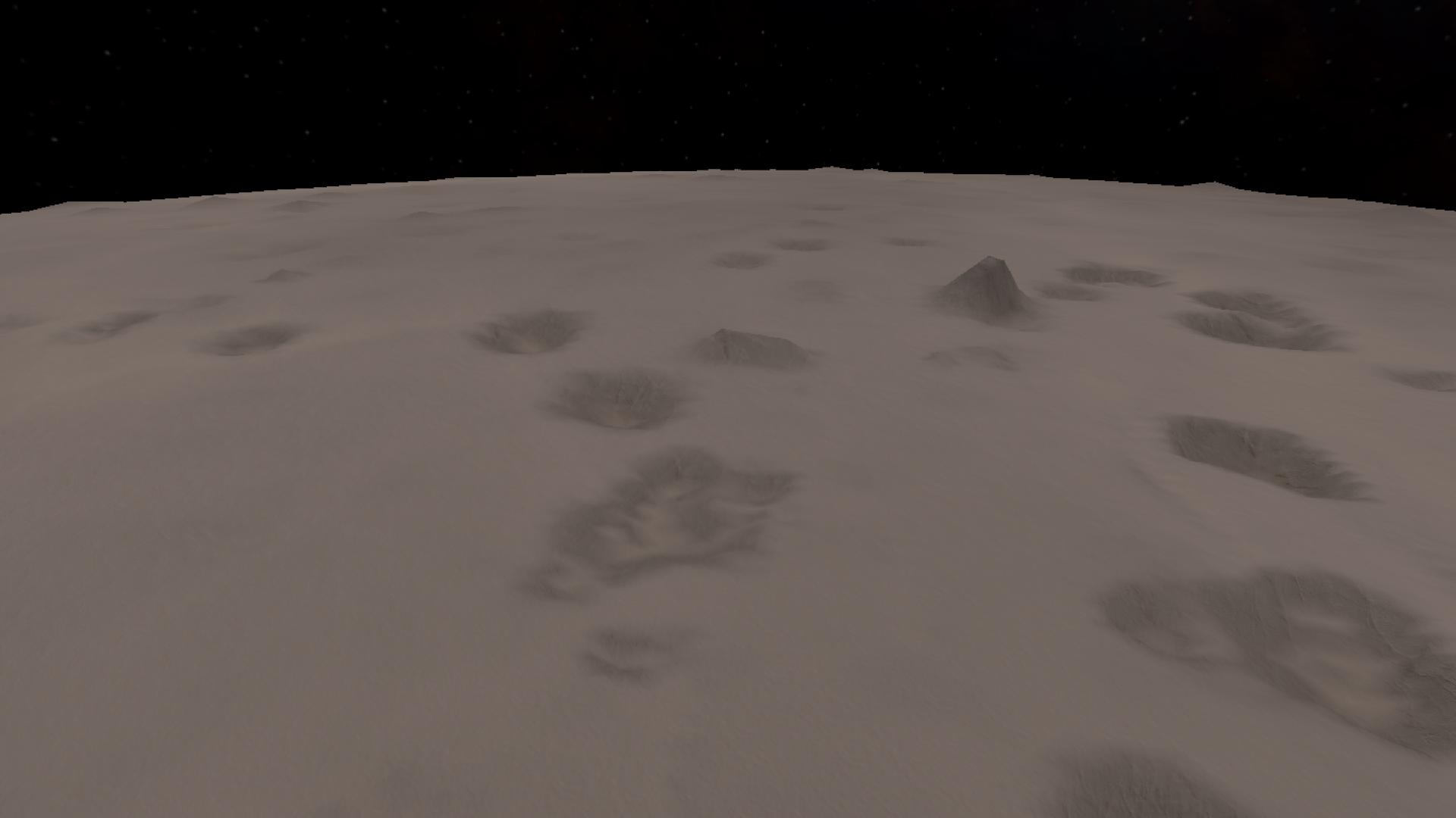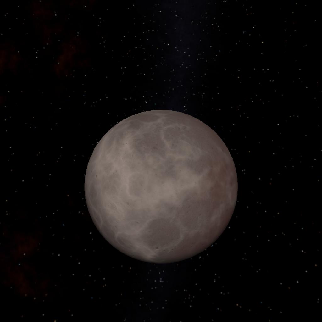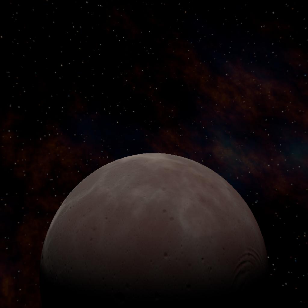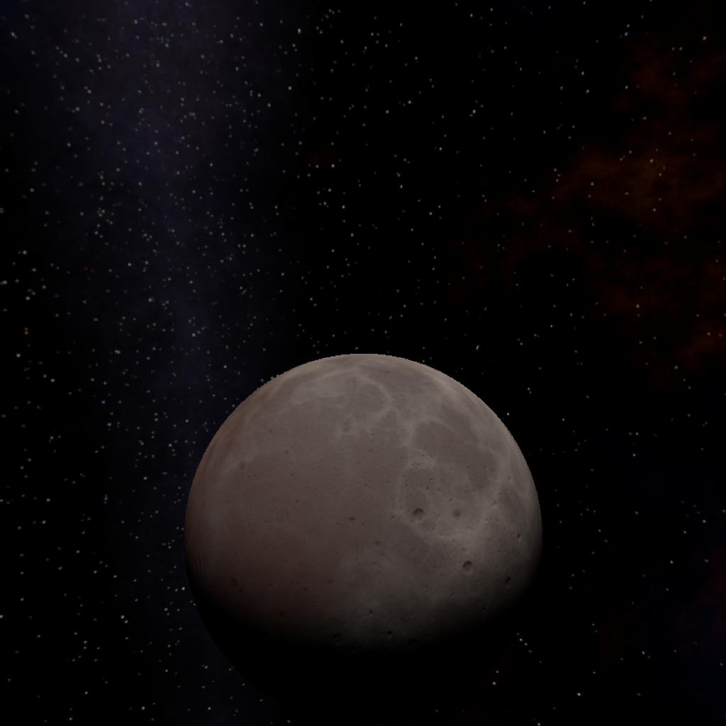 A medium sized rocky moon covered in dust, craters and tholins, with a few mountain. This is the first moon of Seron and has a pretty flat landscape with some mountains peaking from the crater bombarded surface.