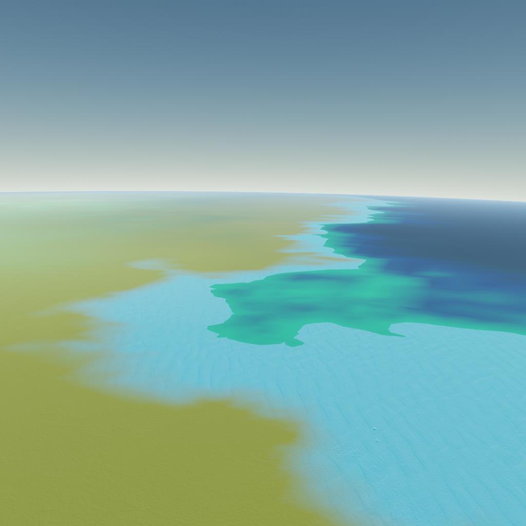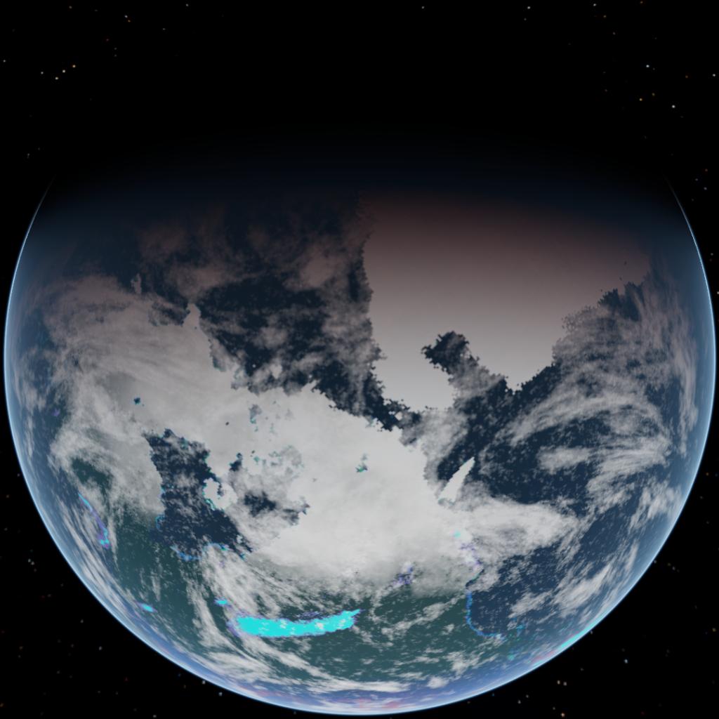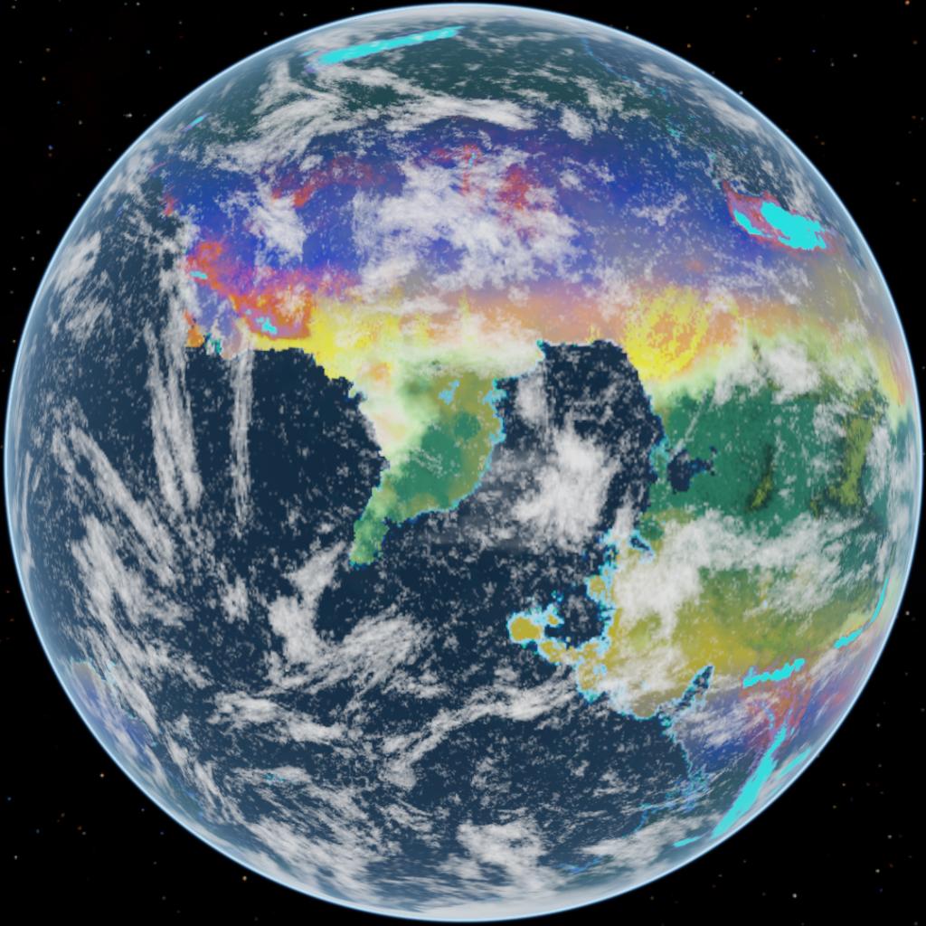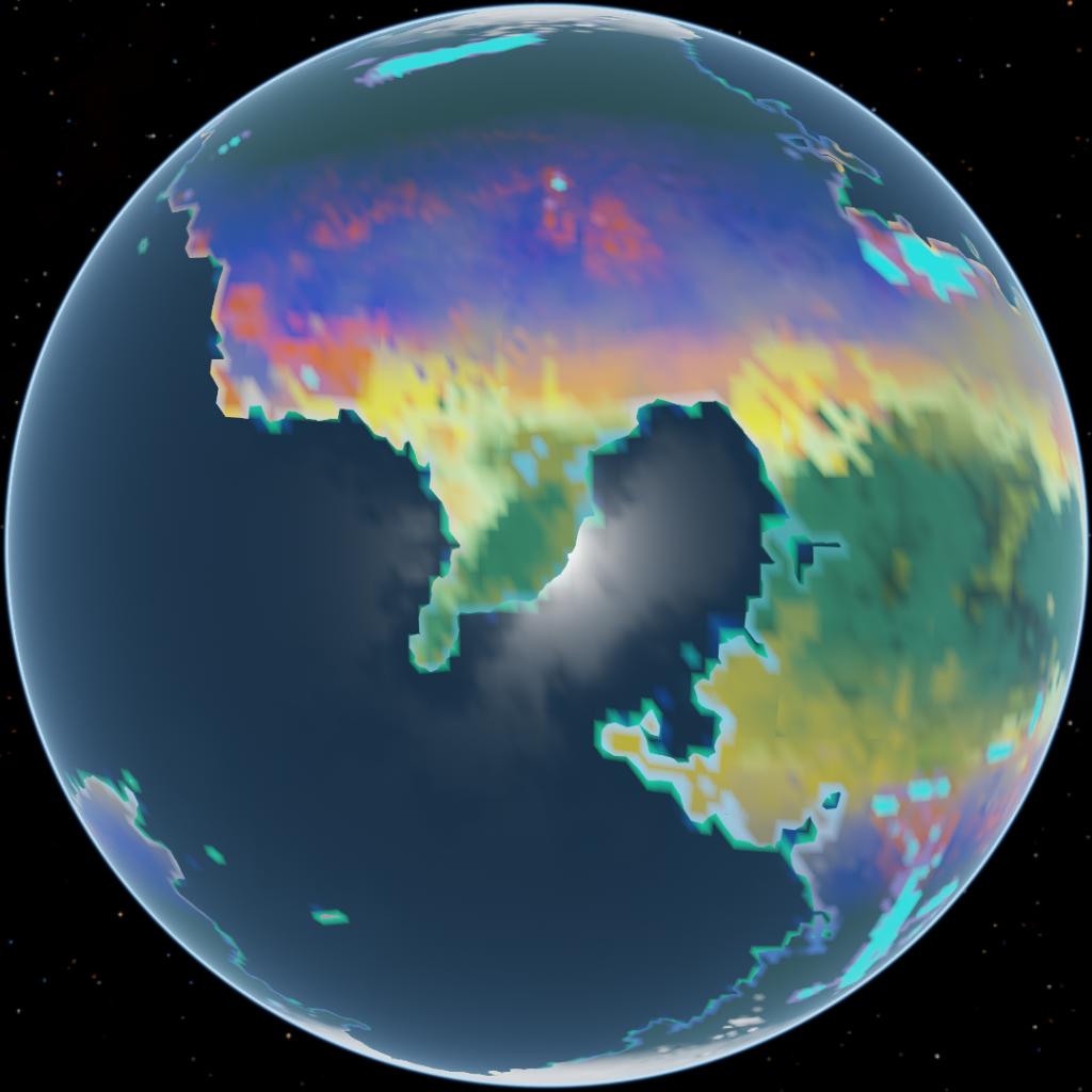 A large, mainly orange and blue planet with some life. It has several continents (most of them connected to the poles), a dense atmosphere, and many oceans. The water is slightly green due to the massive amount of algae in them. Hurricanes are very common on this planet. It has a small launch center at the equator.