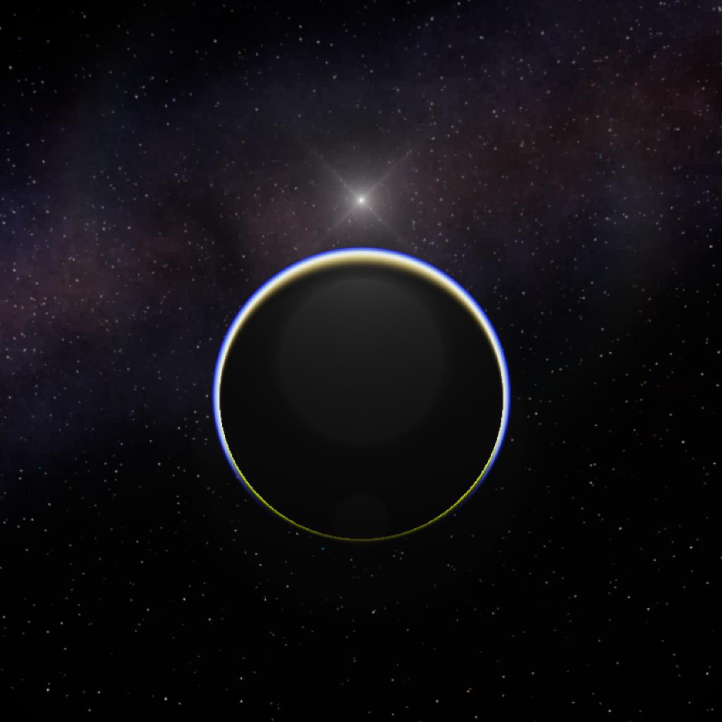 A big moon with an incredibly thick atmosphere, half covered in methane oceans and with a thin ring system.