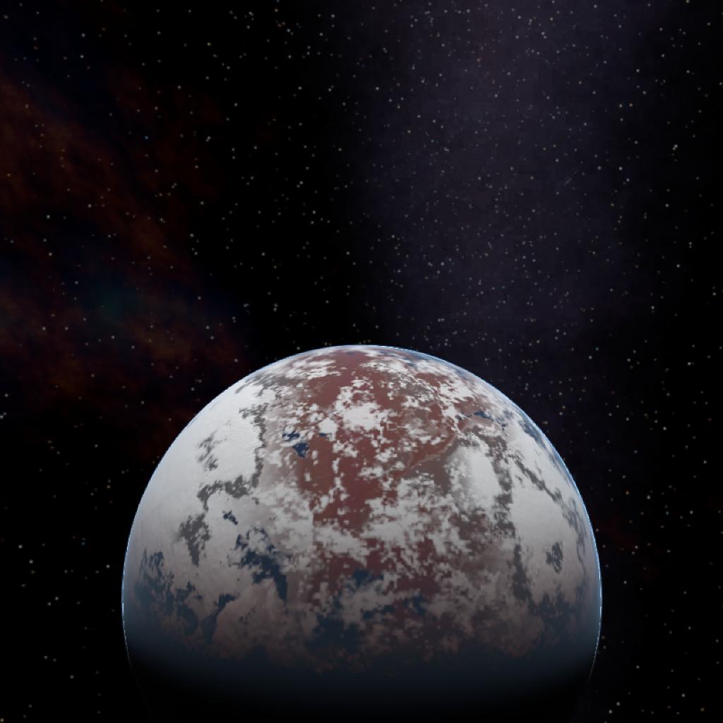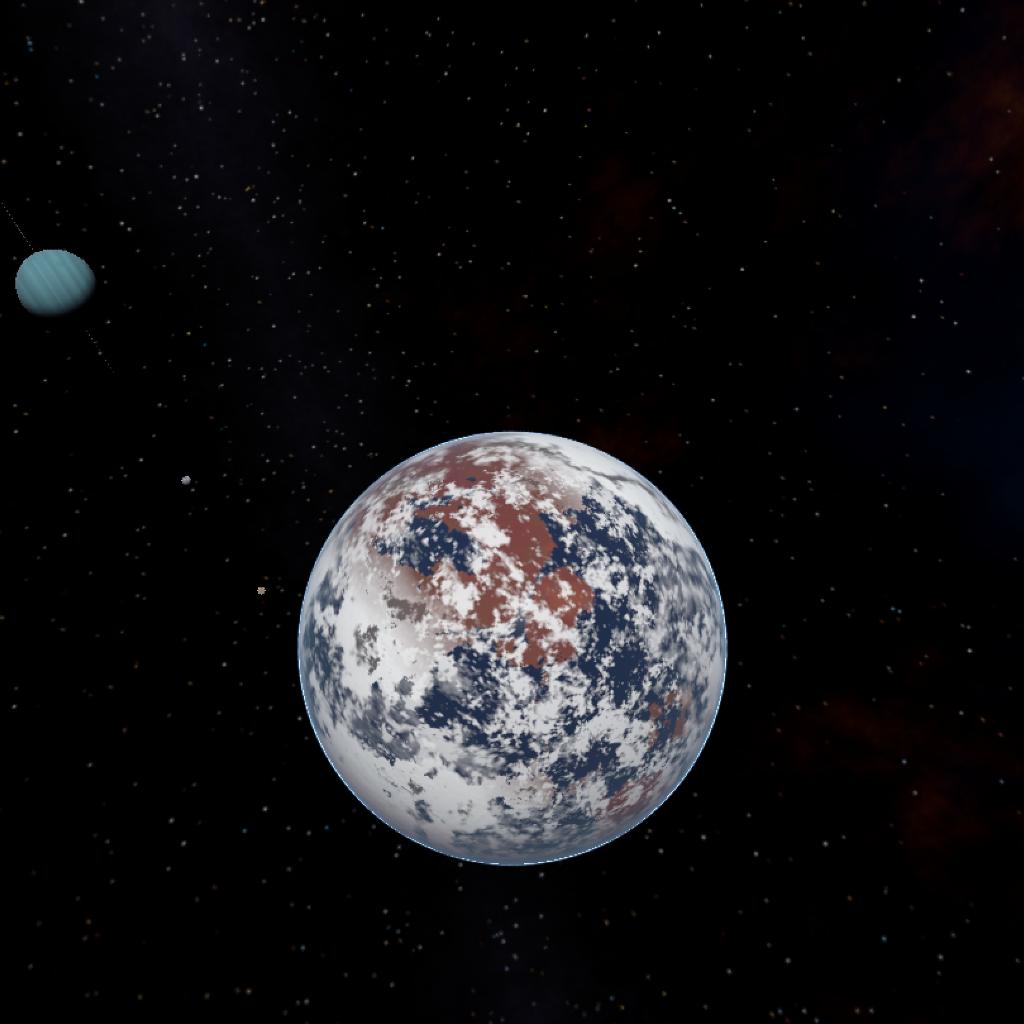 The third moon of Teros. It's a habitable moon with oceans, vegetation and a dense atmosphere. This is a cold moon with an average surface temperature of Just 273kelvin while at night It can be as low as 264. The water seems to not freeze even with such low temperatures. Perhaps something is different in It like the mineral compounds etc. This cold world has large ice caps of actually frozen water. You can find mountain ranges, lakes, some canions maybe and large plains and forests. It isn't clear how diverse the fauna and flora really are. Perhaps marine lifeforms and plants adapted to the extreme cold and to the particular water. This moon Is slightly smaller than Droo and has low tectonic activity. In the past the core of the Moon was way more active but now not so much.