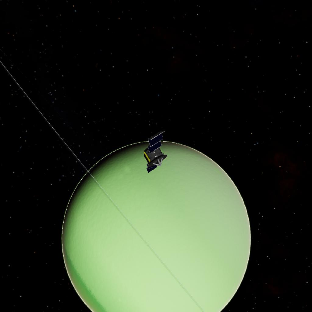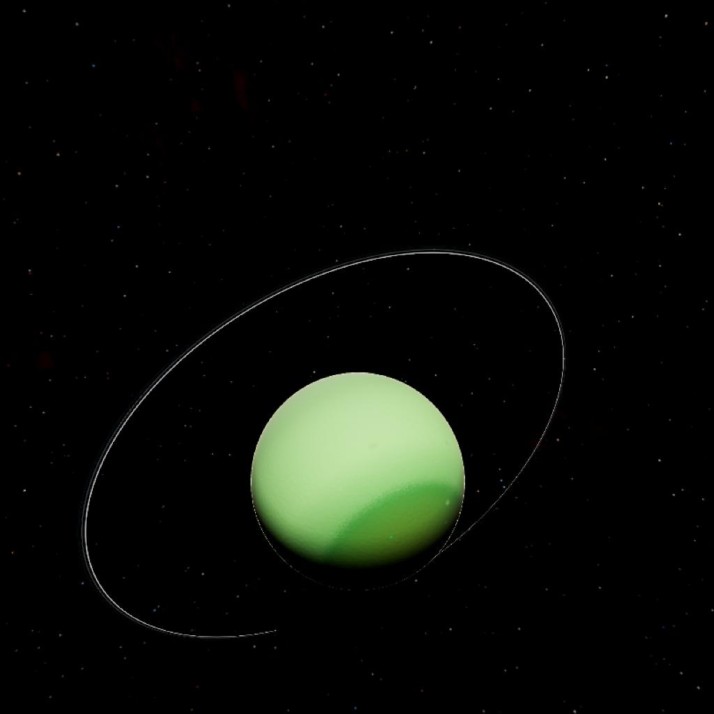 A large gas giant with 3 possible moons orbiting it. Its the 4 largest planet in 'this' system. The bands are weird with the green blending in but one band doesn't. Storms are scatter everywhere on its surface