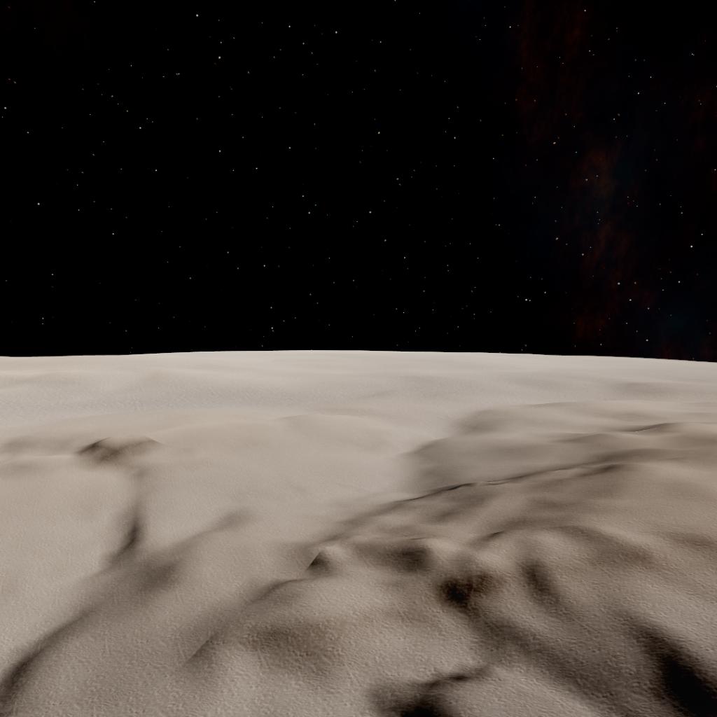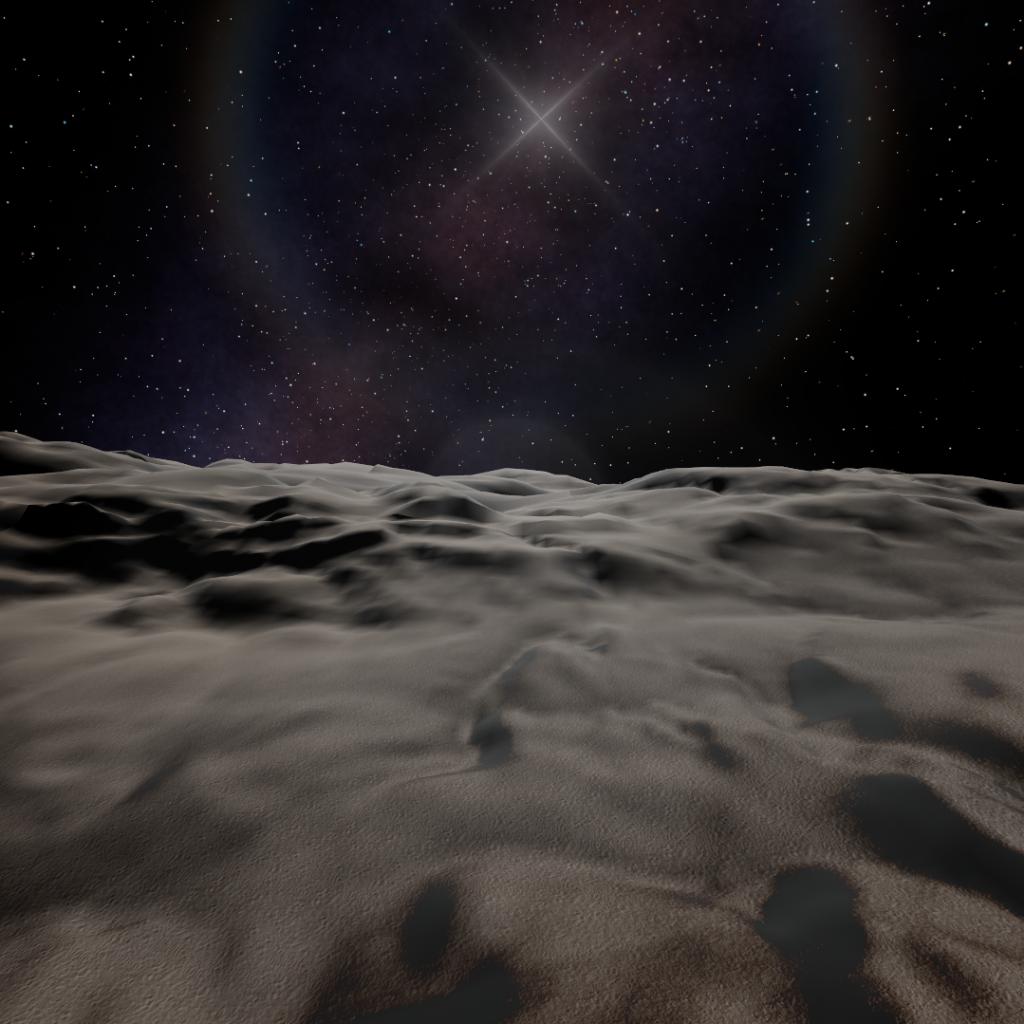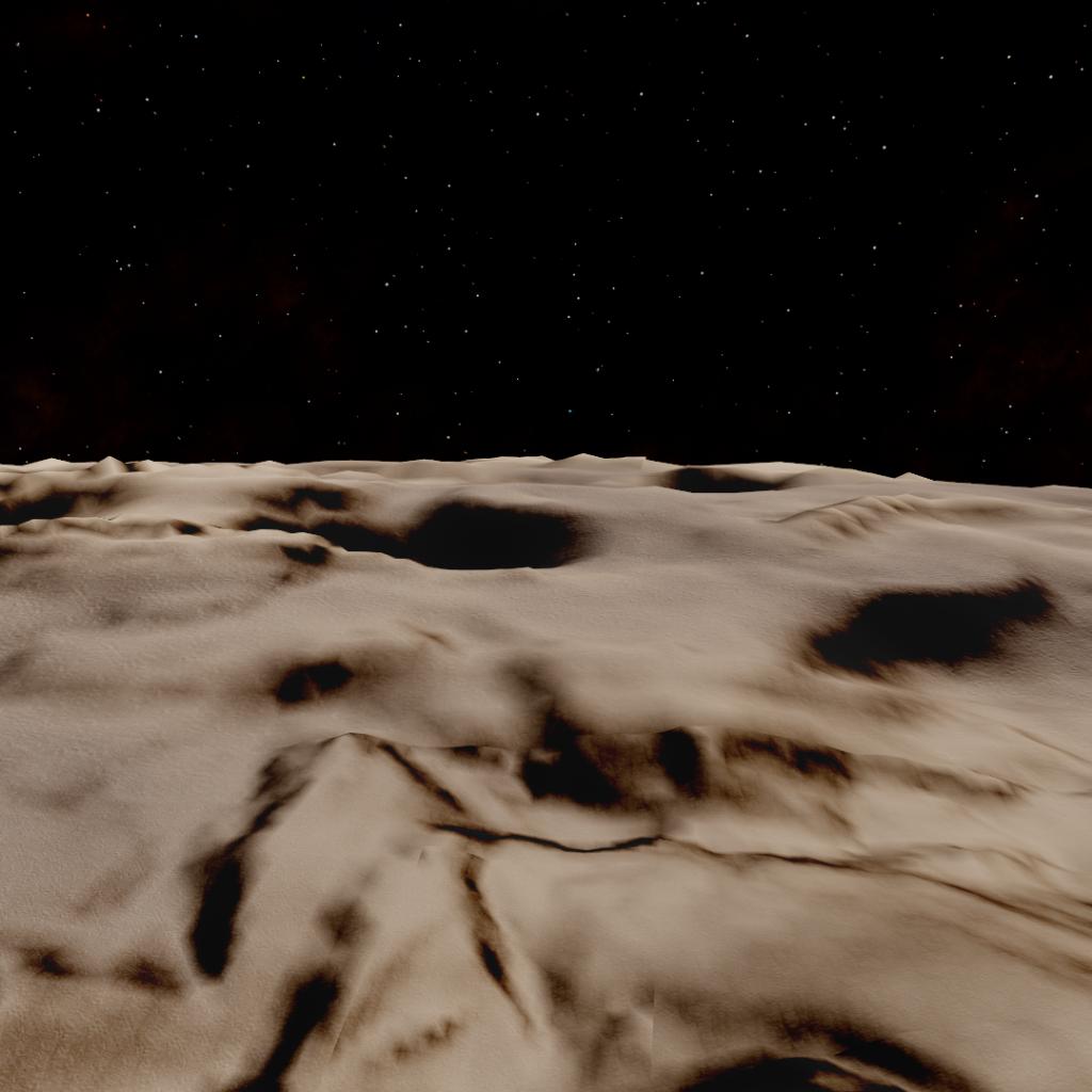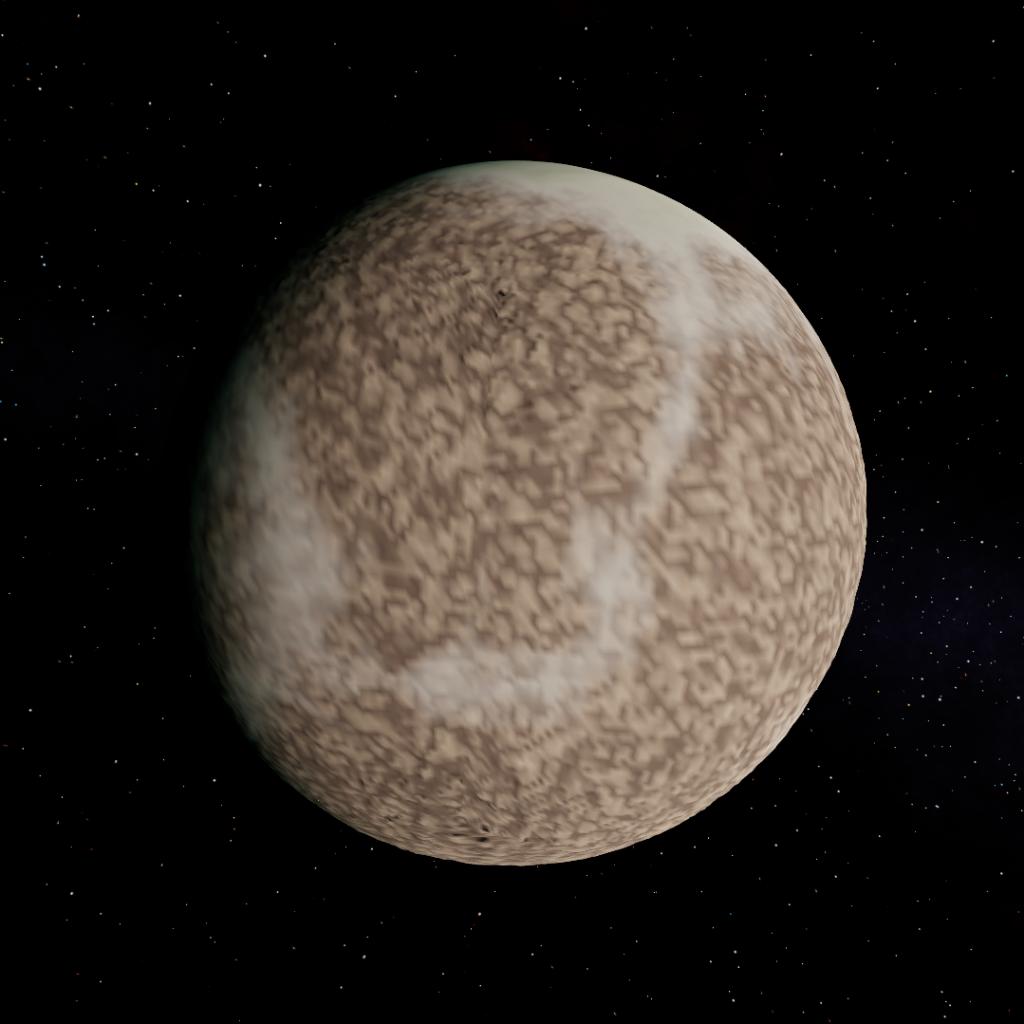 A rocky moon with sand everywhere. It has really bumpy terrain made of mountains and volcanoes, so be careful landing here. At the north pole is a large lowland plain that was filled with lava.
