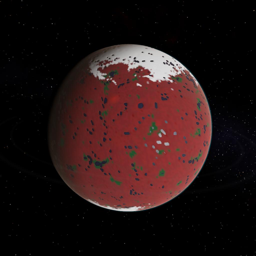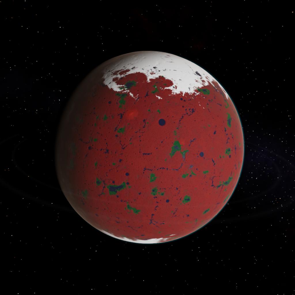 A large martian planet with many dust dunes and sandstorms. It is in the outer habitable zone of the Rintares System, and is partially habitable due to the rather high amount of nitrogen in its atmosphere, however all that's found for now is dirt and water. Many hills dot the surface. There are large pole sections near the top of the planet. Due to the likelyhood of habitabillity on this planet, a base for colinization, research, and terraforming has been constructed here. An extremely thin set of rings that is nearly impossible to see wraps around the planet, and scientists think that it formed because a former moon went inside the roche limit. Areas near the larger, softer water lakes contain dirt, and areas away from the large, softer lakes consist of sand, raging winds and much more rigid lakes. It has many craters that are also filled with water, mostly in the sandy area, which is why the land there is so rigid. The atmosphere has a cyan colored wavelength. It has one small moon with rare minerals that will be mined by the Fordius Federation and PZL Agencies.