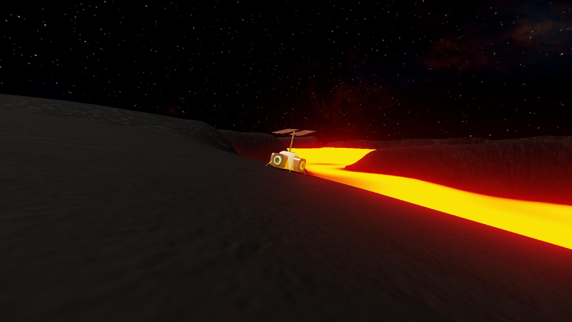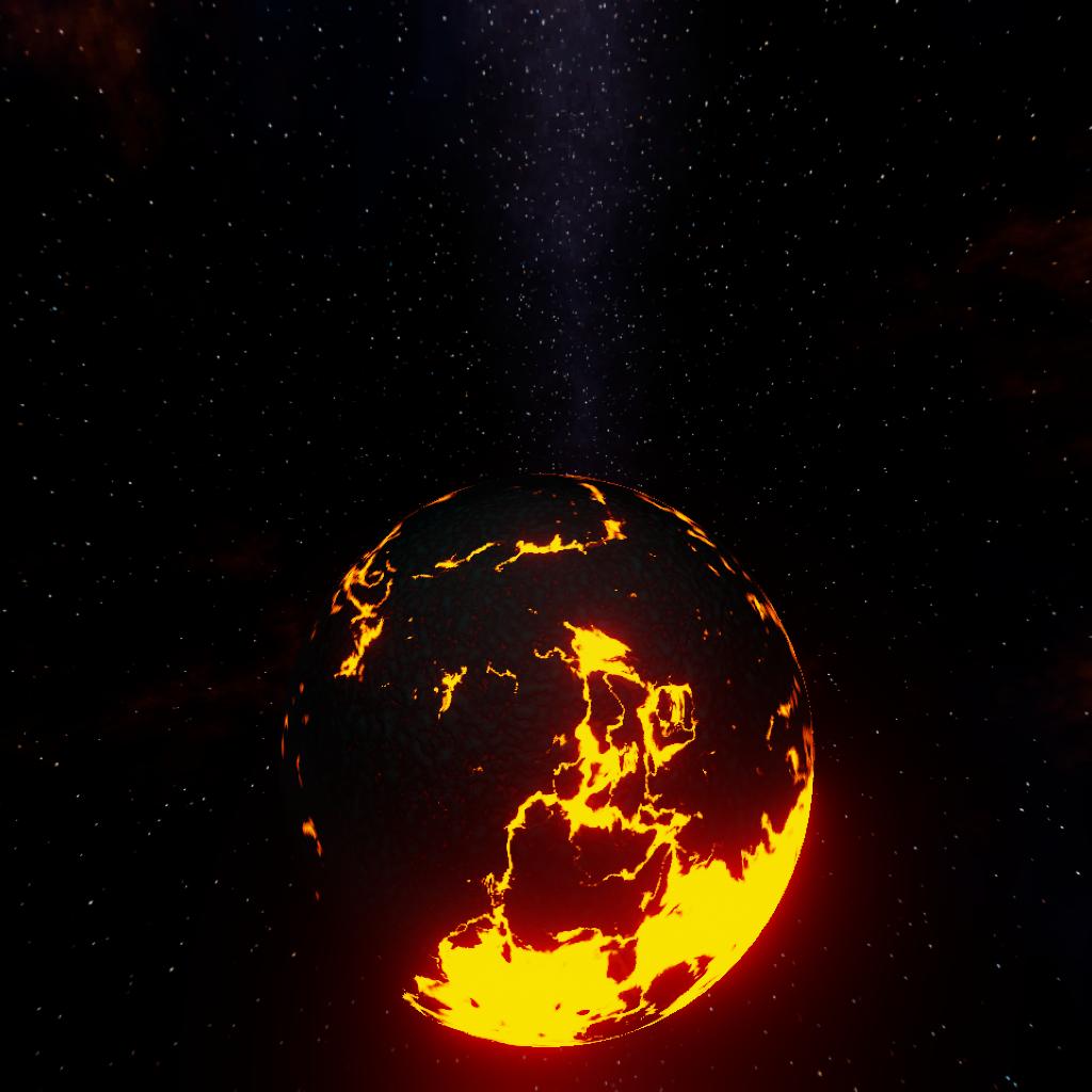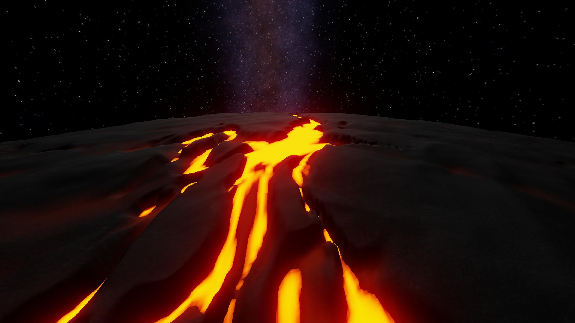 A rocky celestial body covered in cracks containing rivers of lava with a very irregular crust.