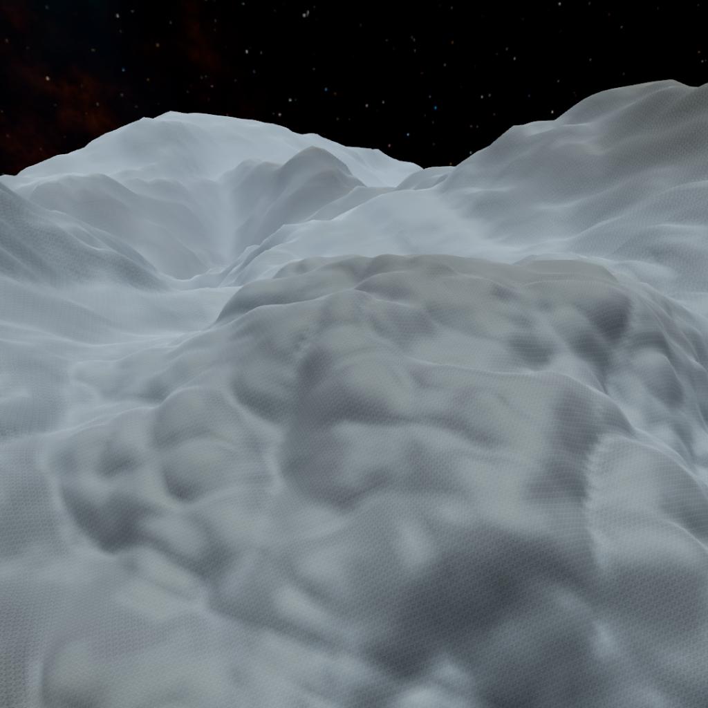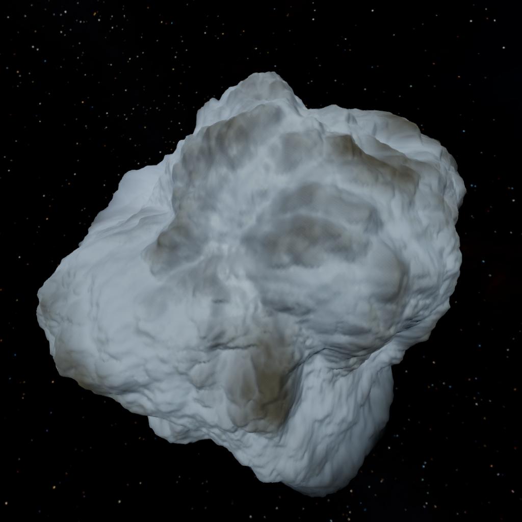 A miniscule comet at the edge of our star system. Its distant, inclined orbit crosses by nearly every planet's path as it tumbled in deep space. It has a bubbly, cracked surface, and its deeper, sublimating ice glows with an ominous shimmer.