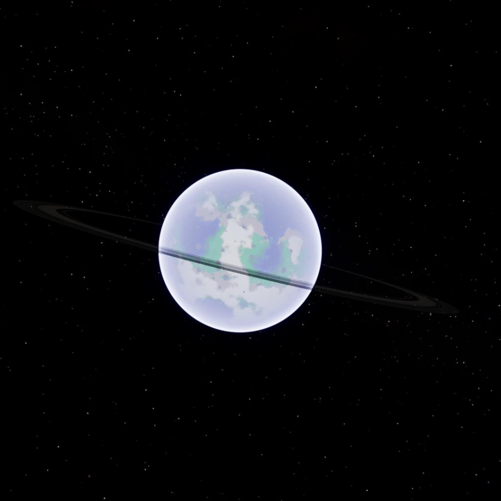 A mid sized habitable terrestrial planet with seas of salt water and continents covered in vegitation, a pale blue atmosphere and a few hot springs.