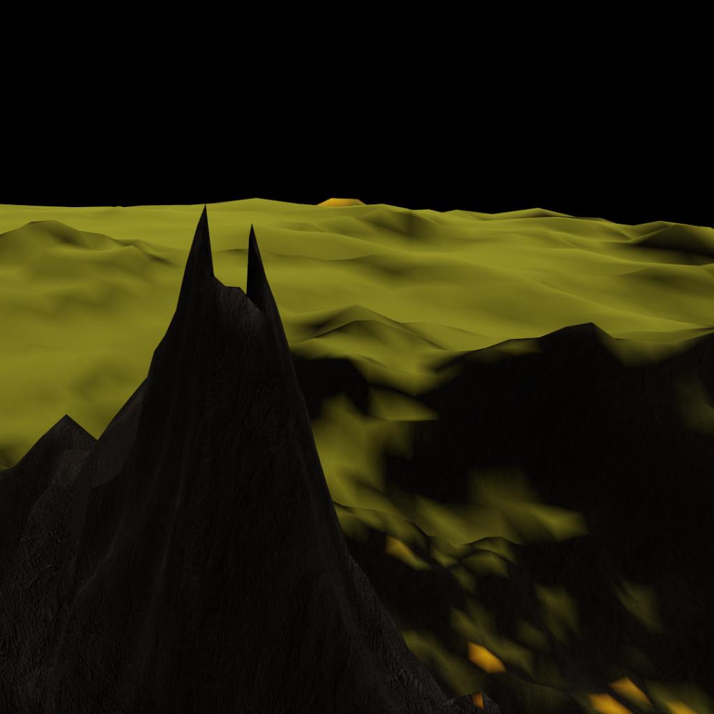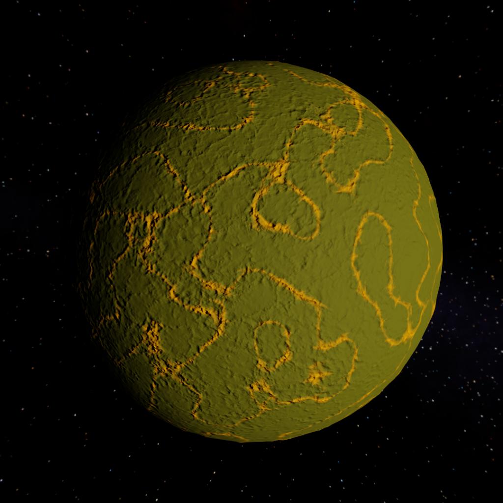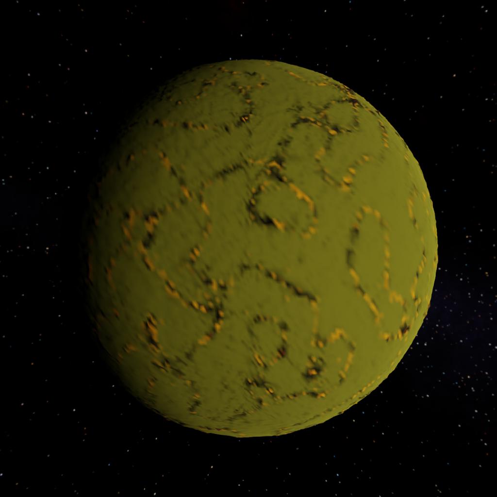A yellow moon orbiting Tydos. The surface is dotted with many inactive volcanoes.