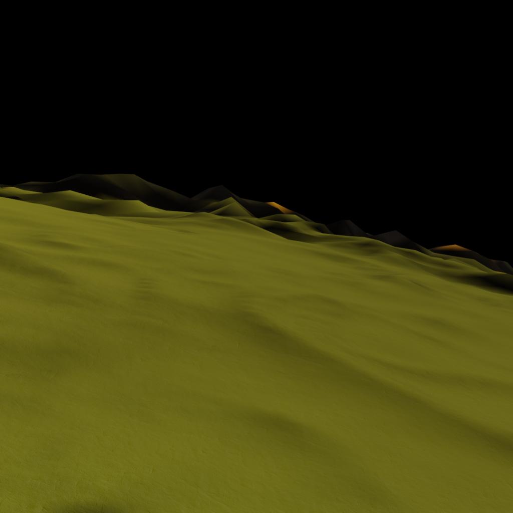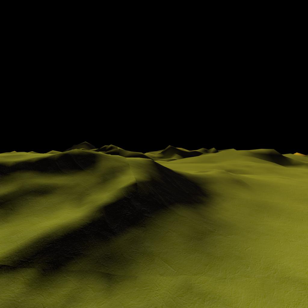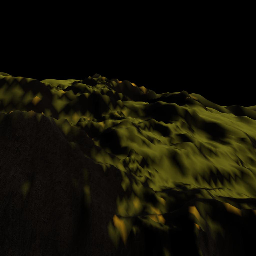 A yellow moon orbiting Tydos. The surface is dotted with many inactive volcanoes.