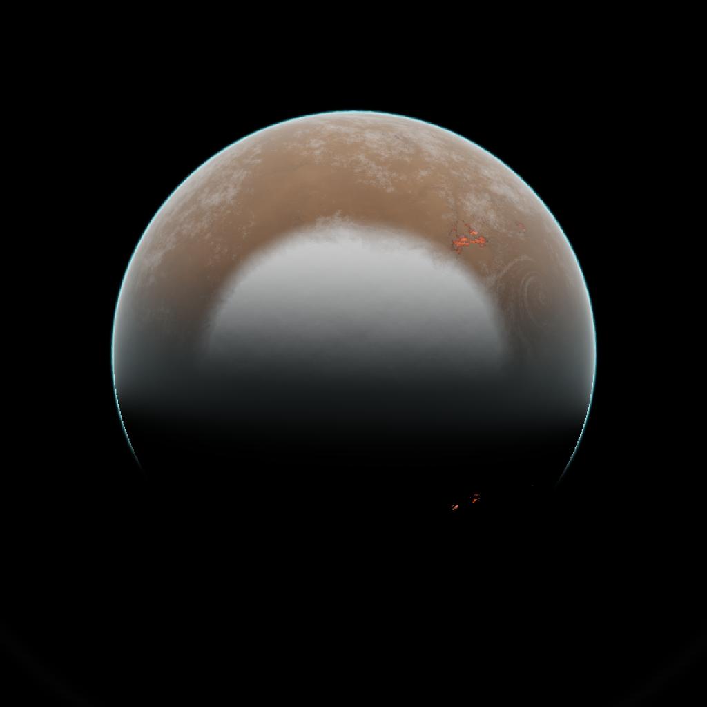 Athenias is the second planet of the KOI-A-9427 system, this planet is a desertic planet in just the right place in the goldilock zone to develop ice caps, but its not habitable, neither in a greenhouse runway, just desert and volcanoes. he has also volcanoes and a really thing ring.