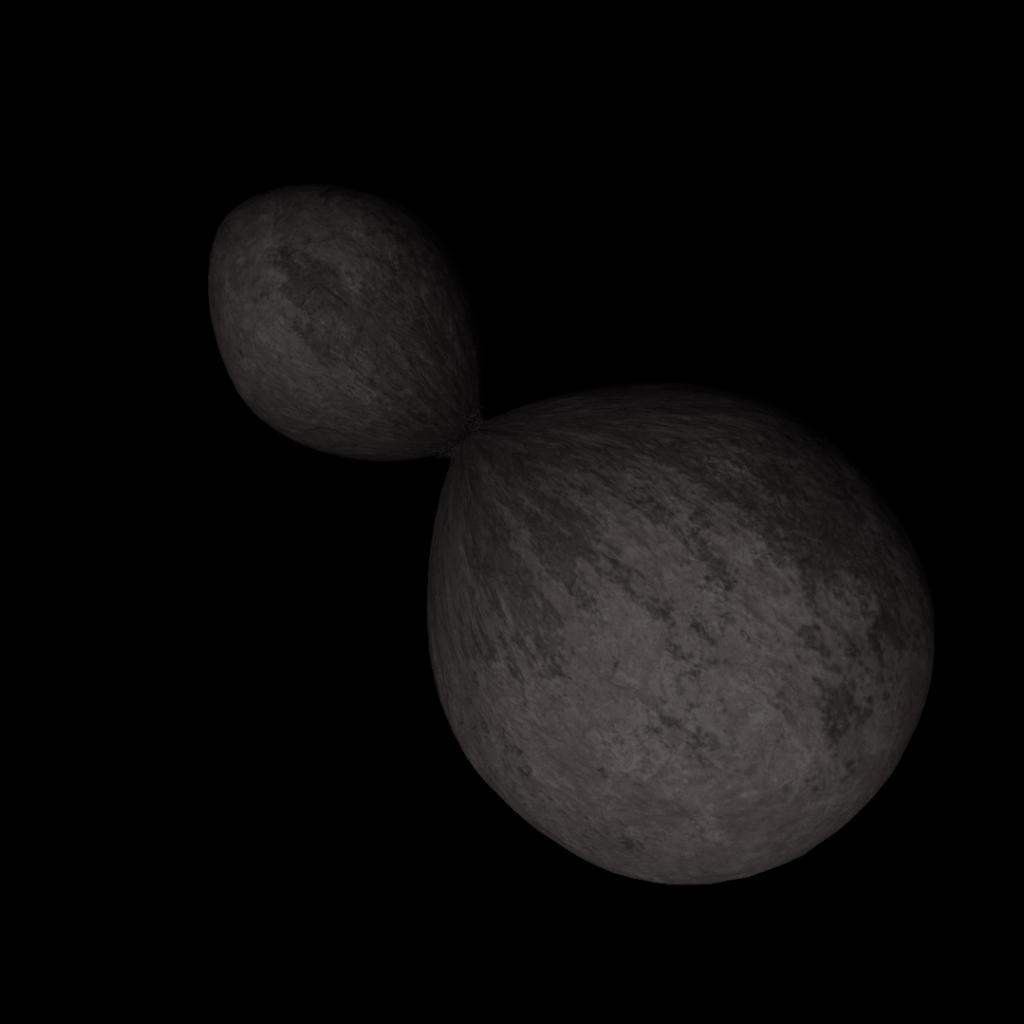 A dark, primeval wanderer drifting in the distant cold of the Kuiper Belt. It is a somber world of deep-red hues and weathered stone, likely coated in a thick layer of complex organic residues. It moves through the shadows of the outer solar system as a silent, undisturbed relic, reflecting so little light that it appears as a mere ghost against the stars. However, this single point of light is actually two: a binary pair pressed so close together they may even touch, locked in an eternal, unmoving embrace as they journey through the void.