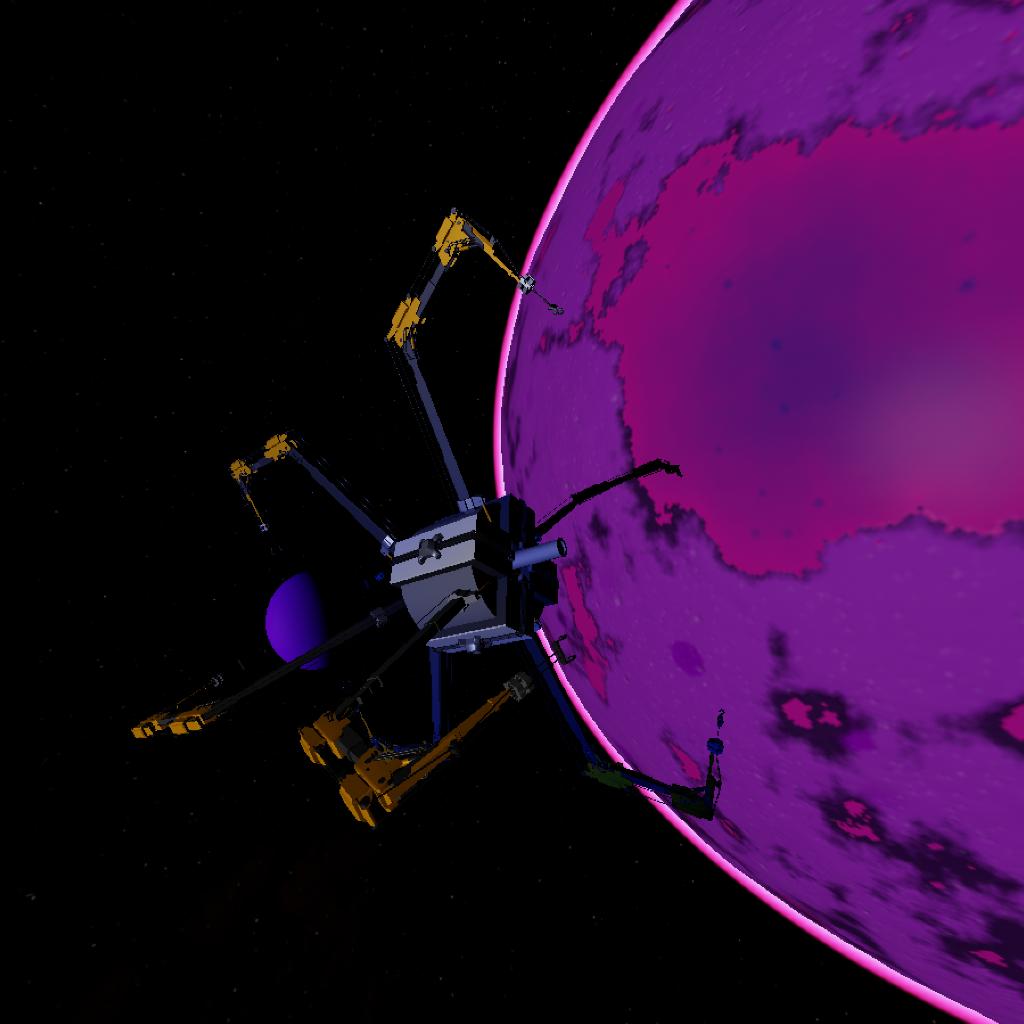A rocky celestial body covered in fine regolith and craters with what used to be big purple lakes and rivers. Now it's only a husk of what it used to be.