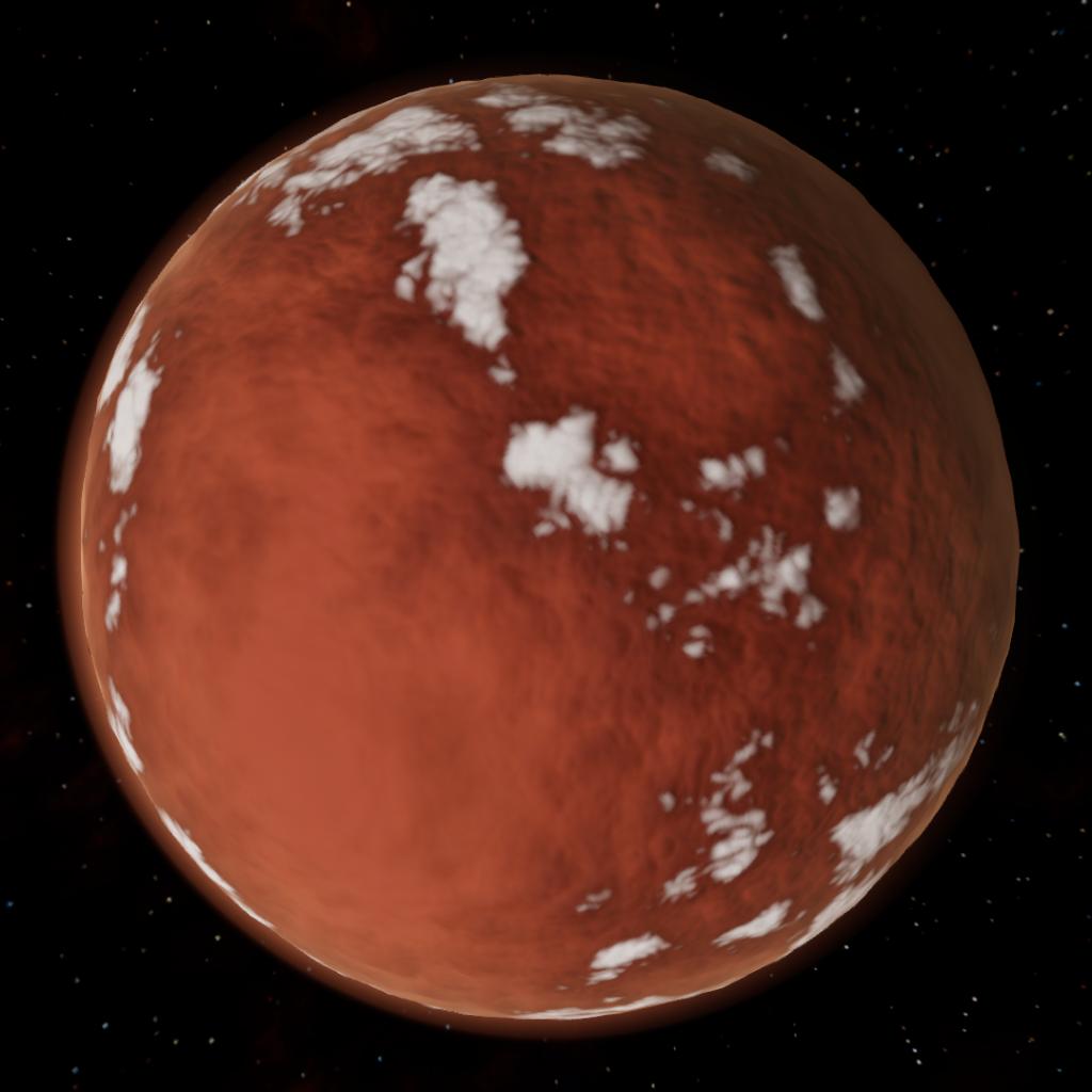 A dry, resource-poor red world with iron oxide dust coating its surface, even drifting up into the carbon dioxide atmosphere as tiny iron flakes. Be wary of dust storms.