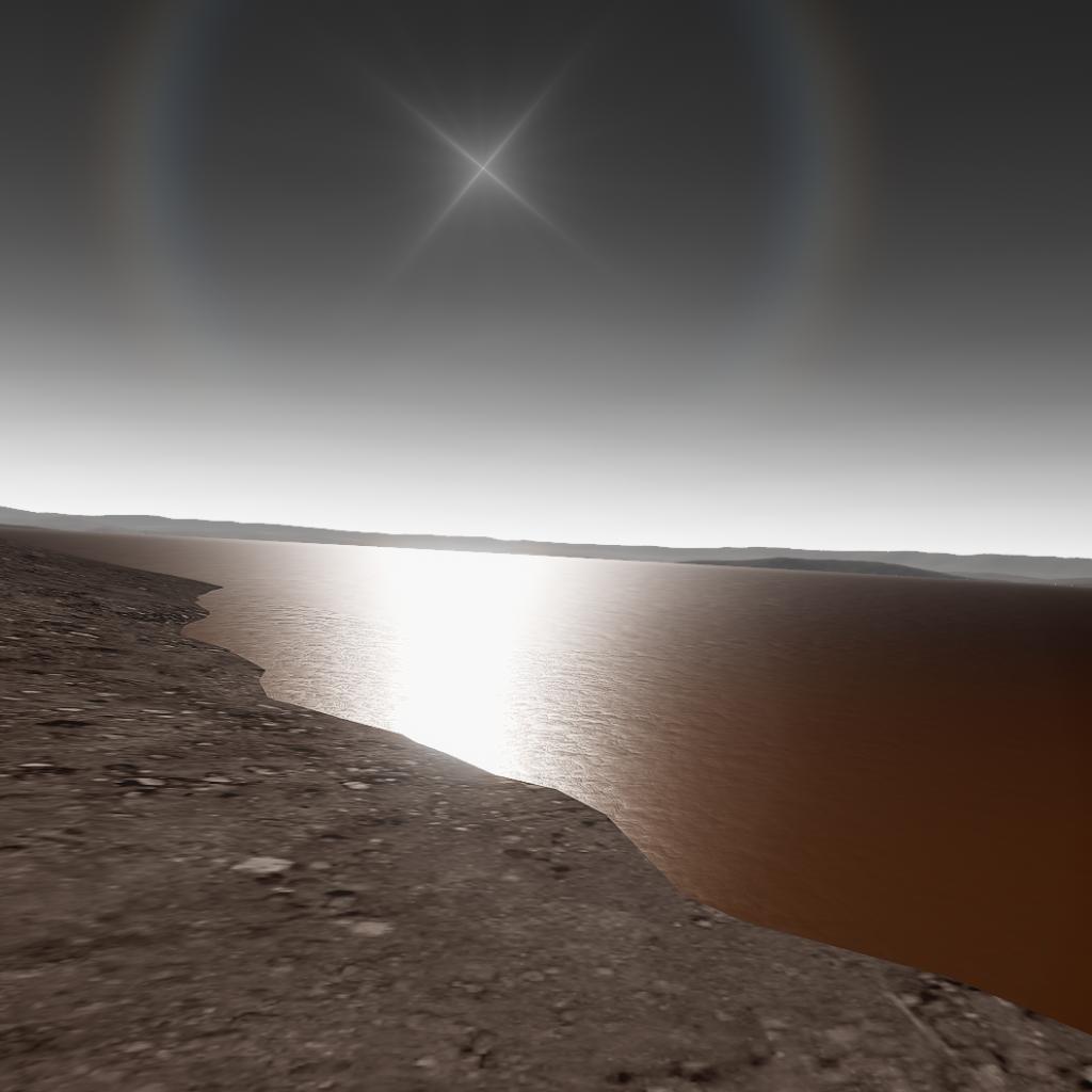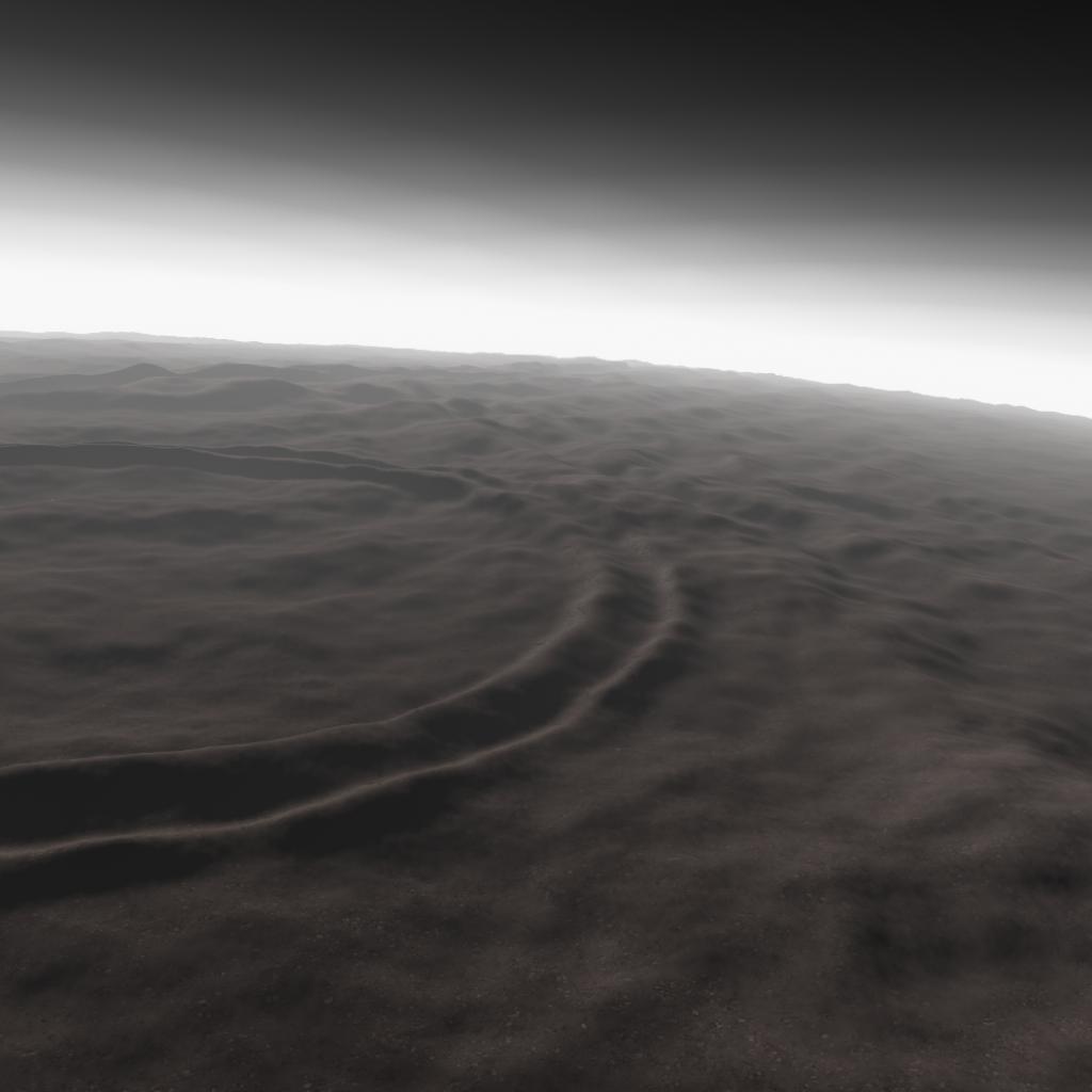 A moderatley sized scorched and barren rocky planet with cratered fields, volcanoes and ash plains with a thin atmosphere on top and some blood-red molten sulfur lakes.