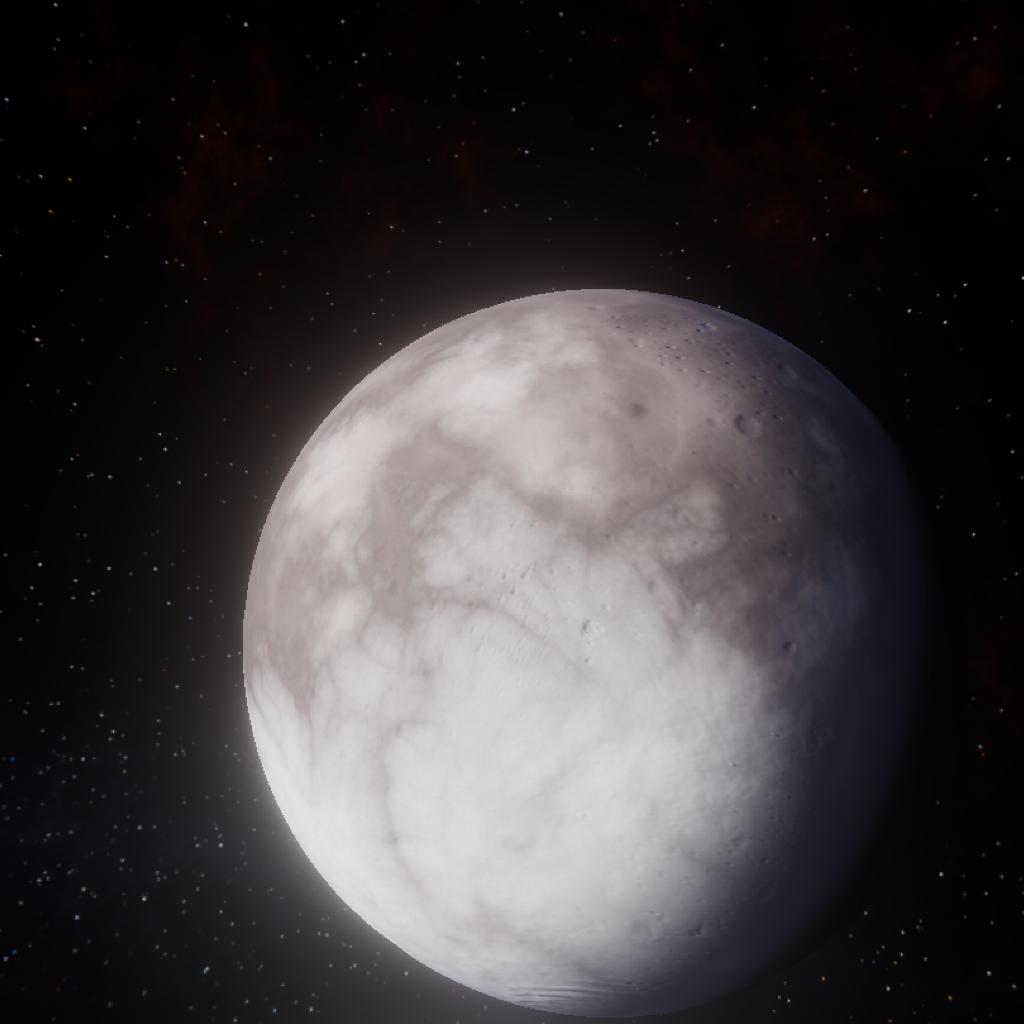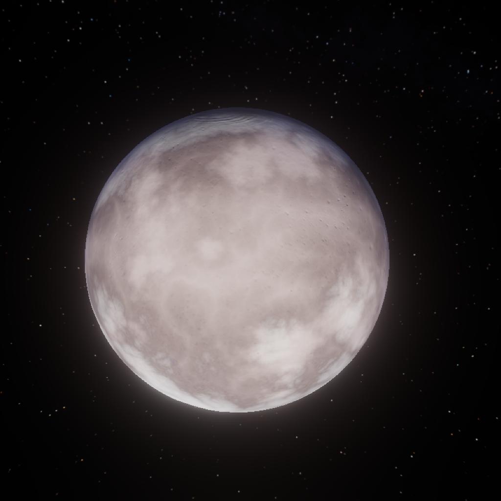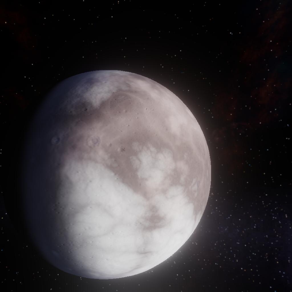 4347 I-B also known as Gelos Is a medium sized rocky moon orbiting Cliricios. The moon is covered in dust aswell as sheets of ice which extend from the poles all the way close to the equator. The blue atmosphere is very thin providing no heat. This Is the closest moon of Cliricios and has a small moon called Ivros. This moon has long days for its size with a rotation of 17hours, more than Droo.