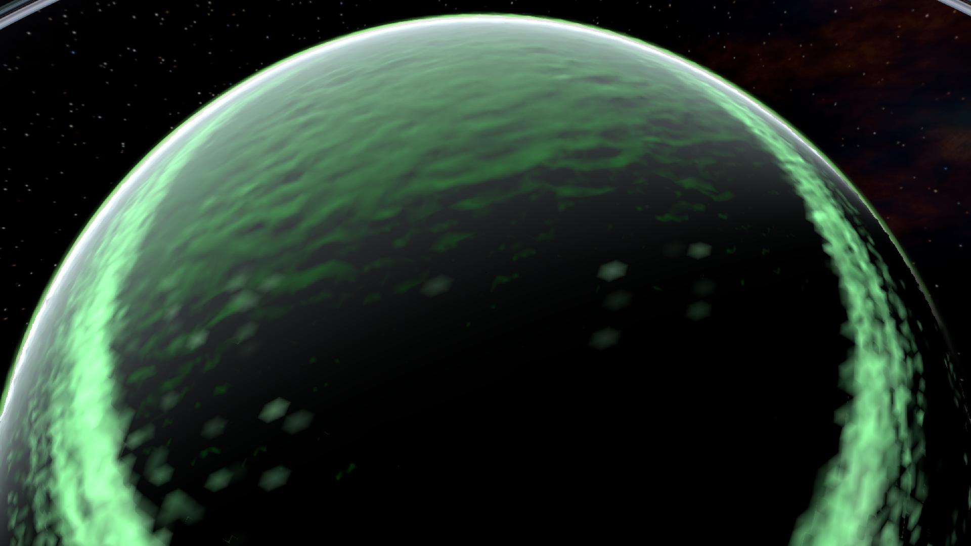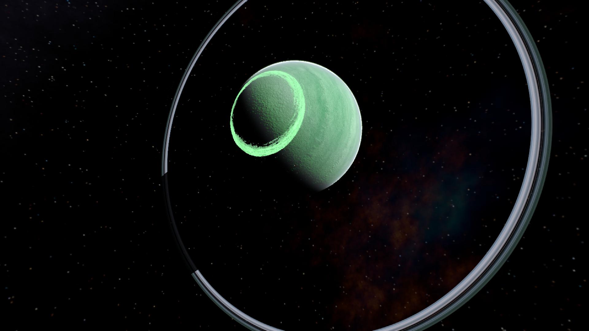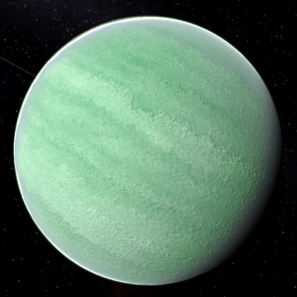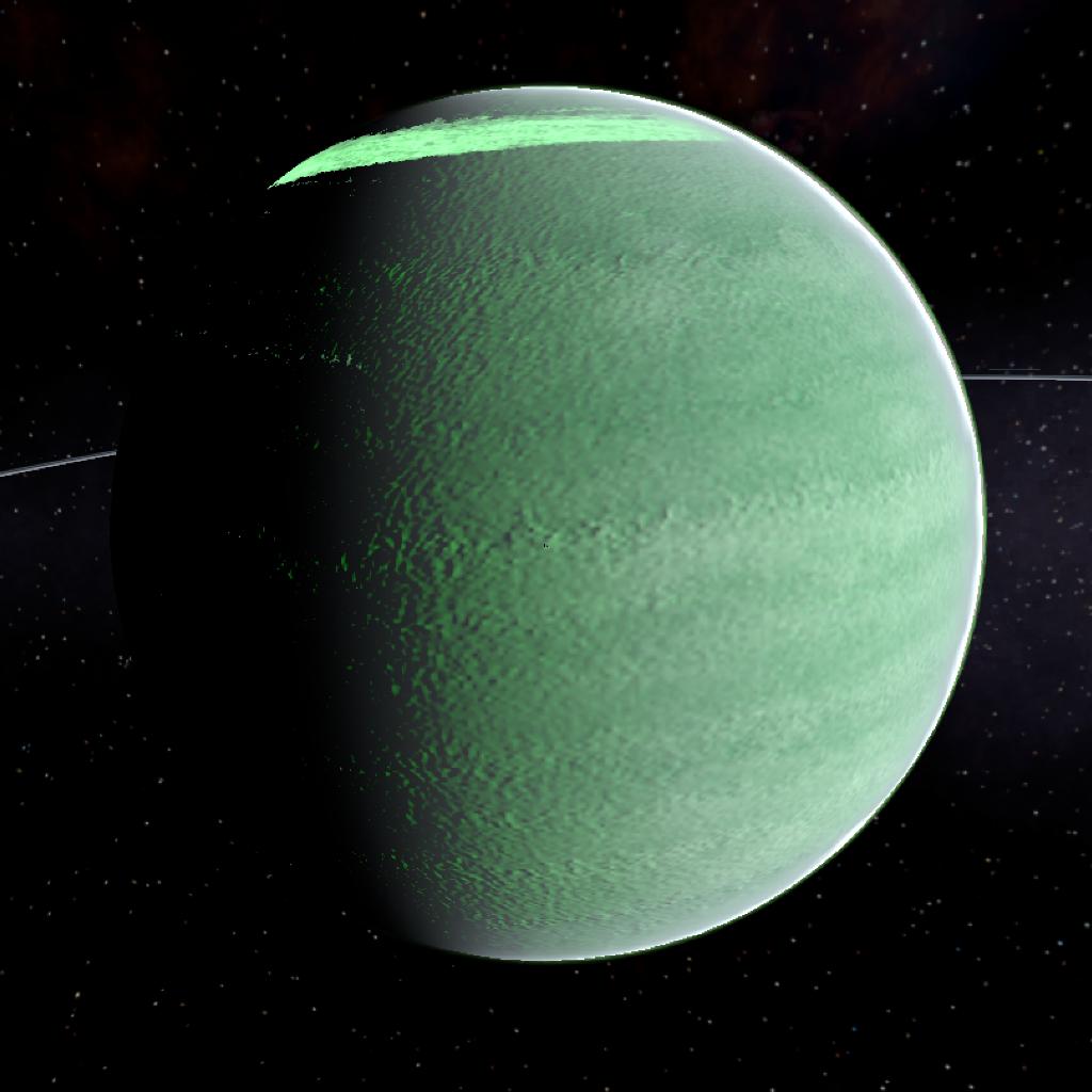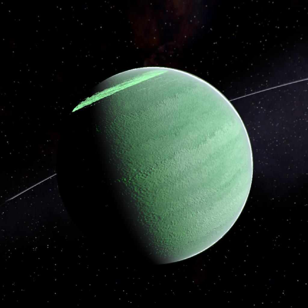 A green gas giant with a small ring system and beautiful auroras at the poles due to its strong magnetosphere. This gas giant has 6 moons in total.