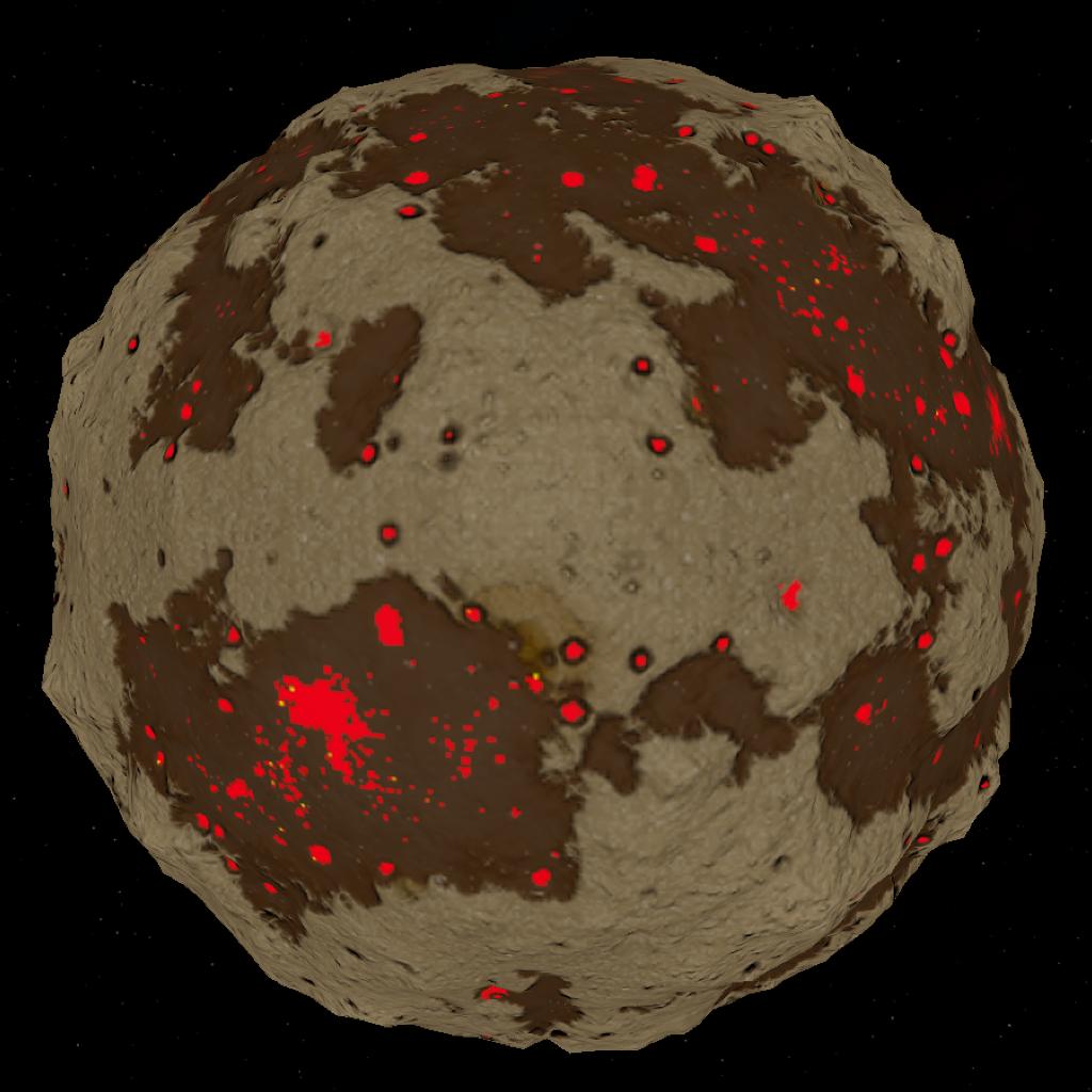A rocky celestial body covered in fine regolith and craters, with molten magma on its surface