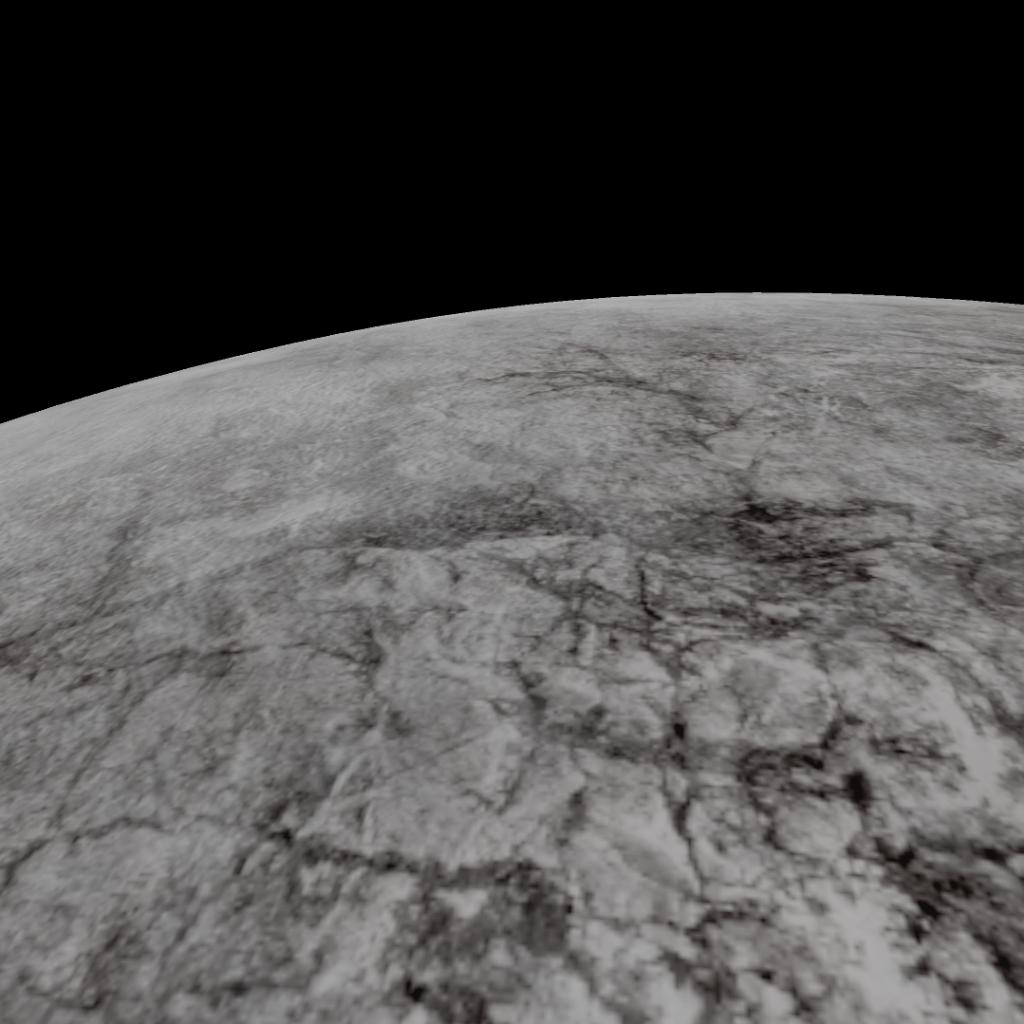 A pale, fortress-like world standing watch within the outer streams of a gas giant's empire. One half of this moon is a battered graveyard of ancient craters, while the other is scarred by a web of brilliant, skyscraper-high ice cliffs and a colossal, jagged ravine that cuts deep into its frozen crust.