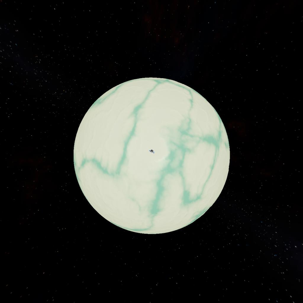 From orbit, Delano is pale silver-blue, set in sharp contrast against Sedna's dark oceanic background. Occasionally, sunlight from Sedna's pink sunrises breaks through the tenuous atmosphere, casting a very faint magenta glow around the limb of Delano — a delicate but unmistakable signature of this frozen satellite.