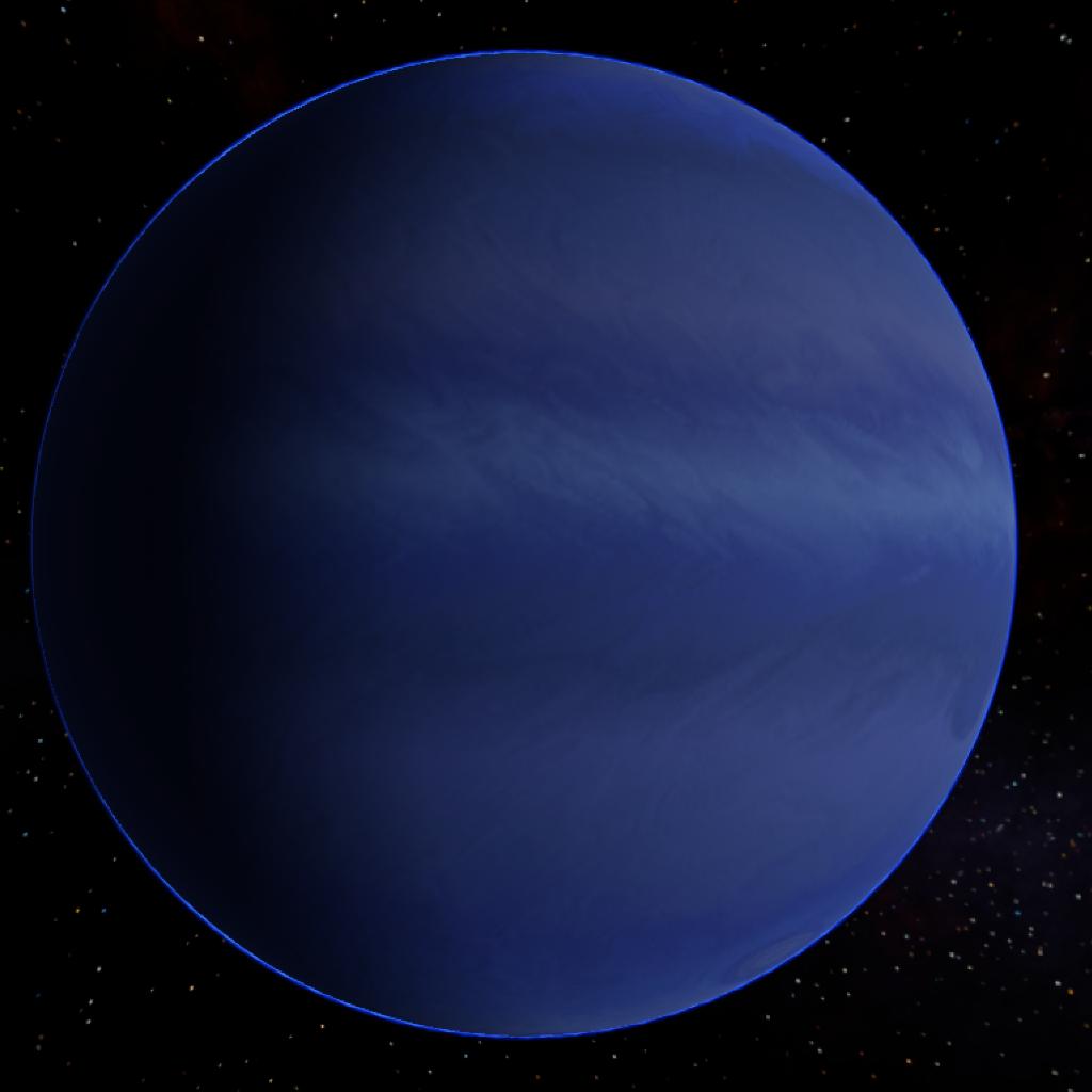 A large ice giant with a chaotic top layer of clouds and large storms.