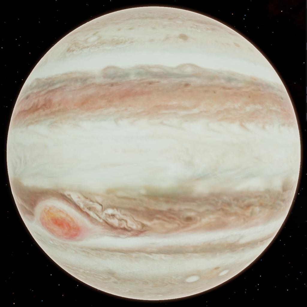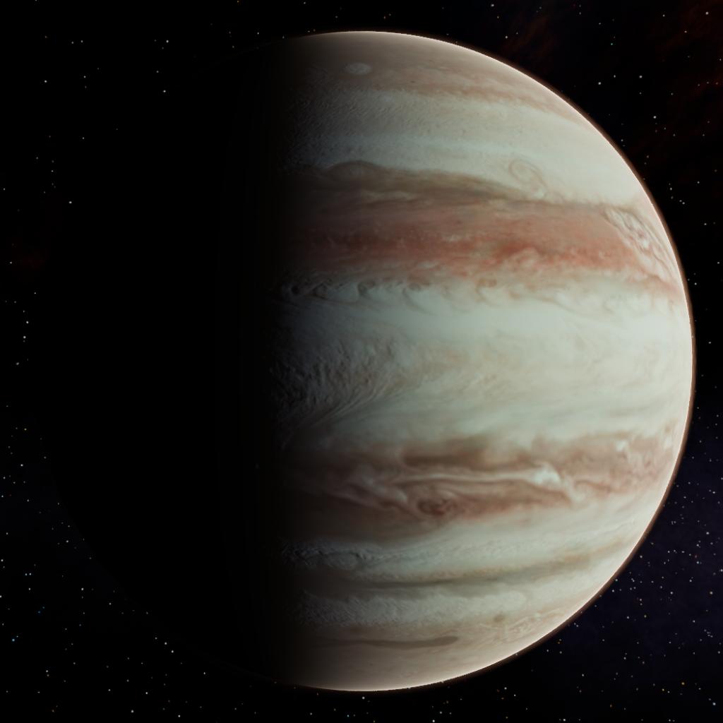 Despite it's size, the planet rotates very quickly. This high-speed rotation flattens the planet at the poles and drives violent, long-lasting storm systems and high-velocity "jet stream" winds.