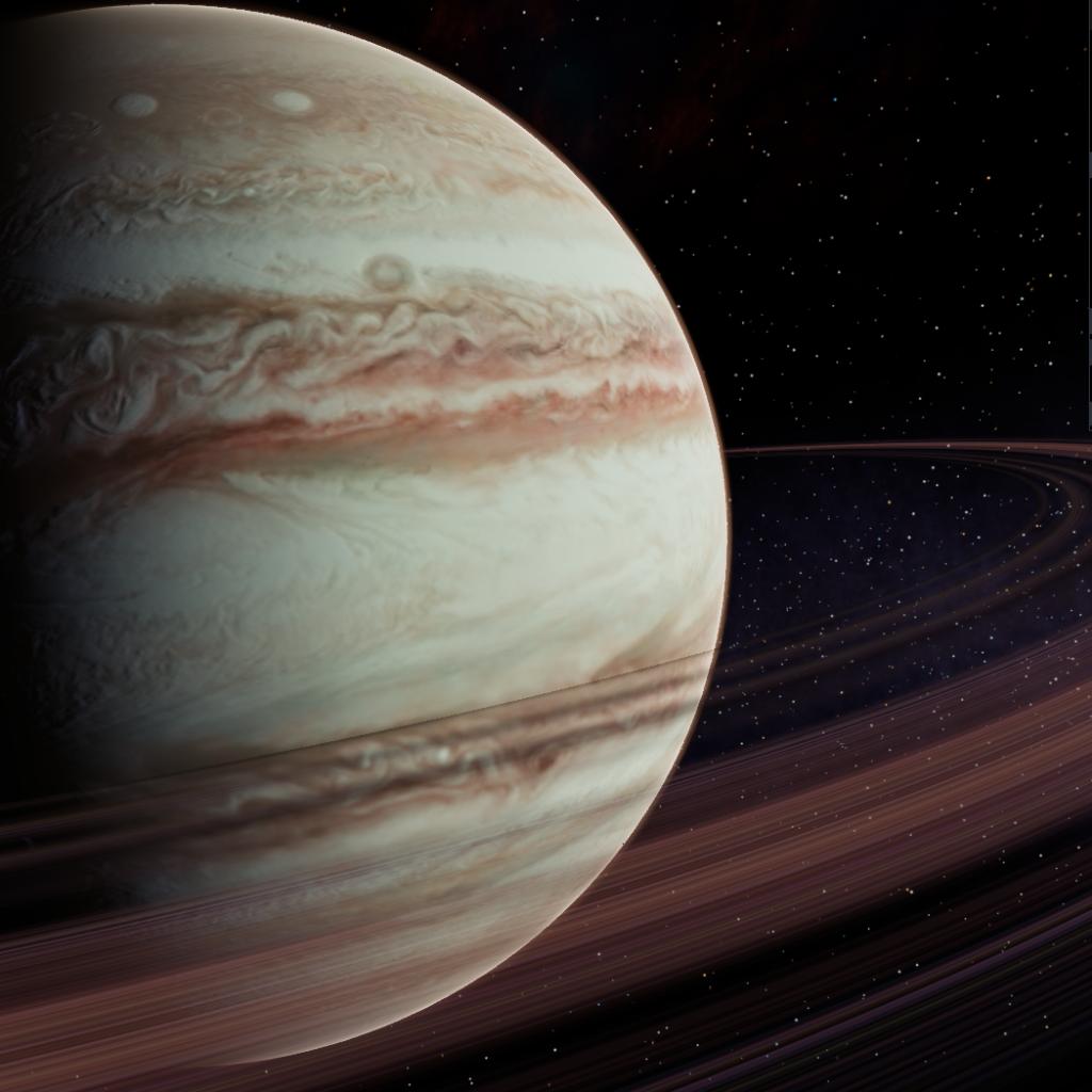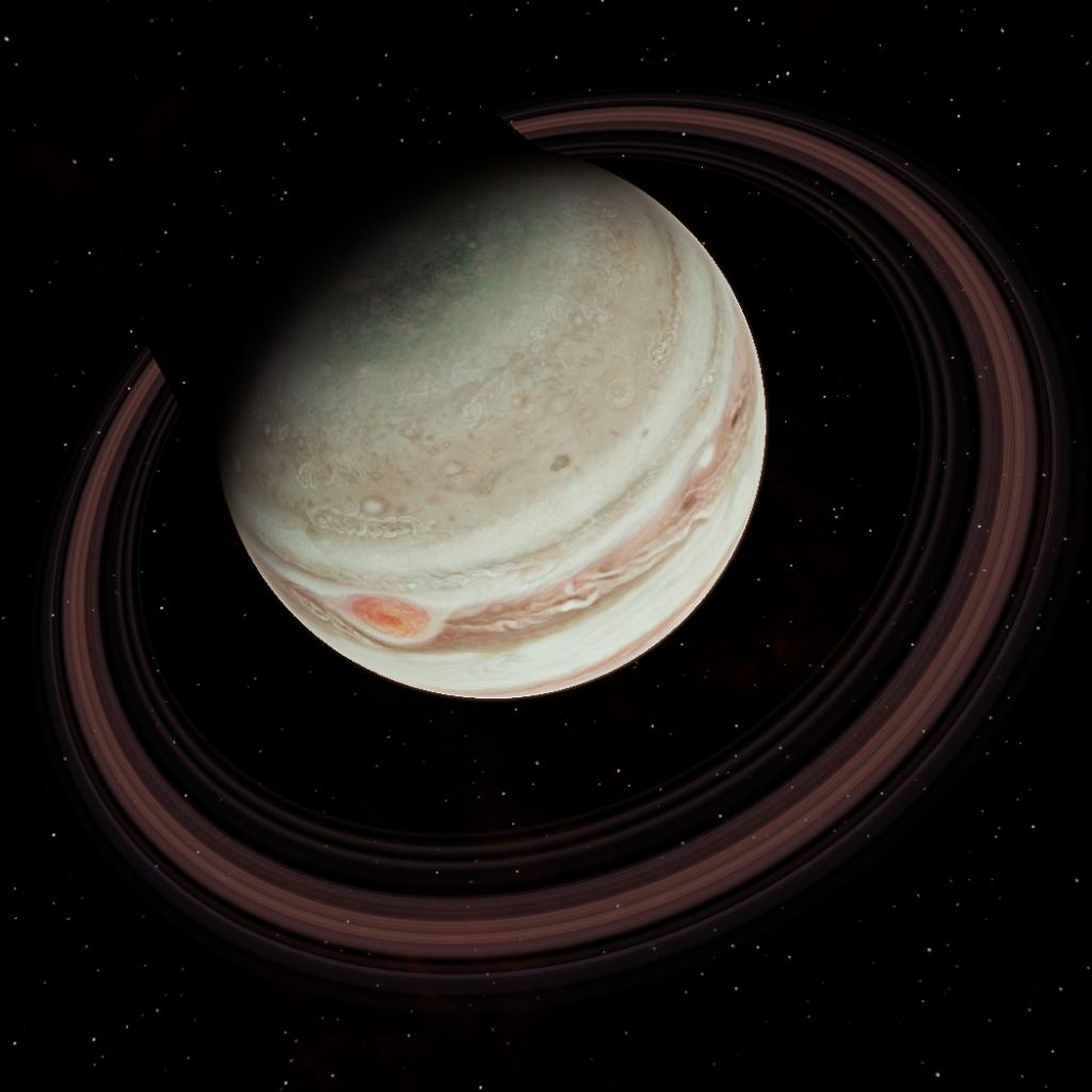 The reddish-brown rings are given by radiation from the planet's intense magnetic field which hits methane ice on ring particles, creating tholins— organic compounds.