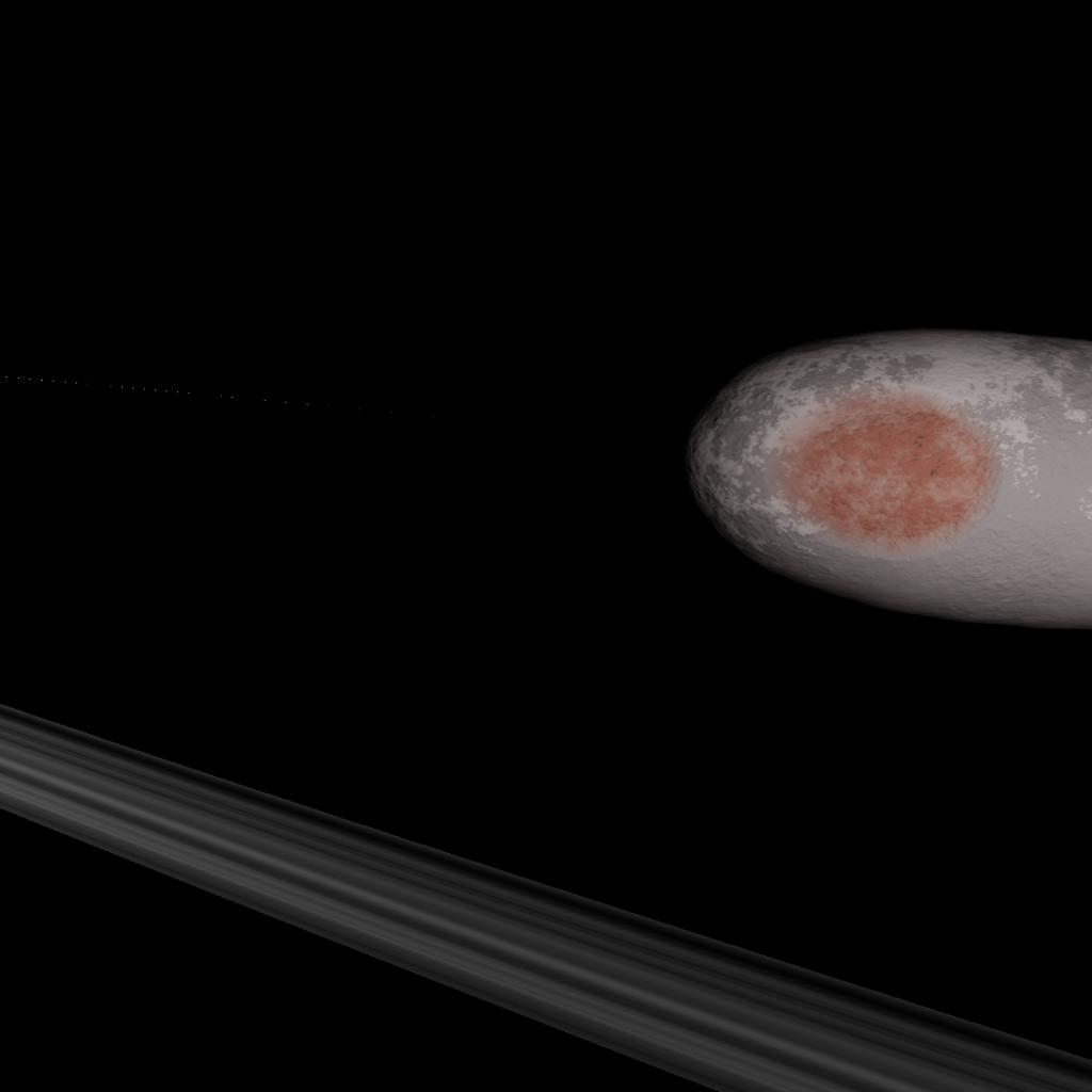 A distant, fast-spinning dwarf planet located in the frigid Kuiper Belt. Due to an ancient, massive collision that left it spinning once every four hours, the centrifugal force has distorted this world into a triaxial ellipsoid, resembling a giant, elongated pebble. Its surface is a brilliant, reflective shell of nearly pure crystalline water ice, masking a dense rocky core. This dwarf planet is the heart of a chaotic family, orbited by two small moons and a thin, dark ring of debris, all remnants of its violent past.