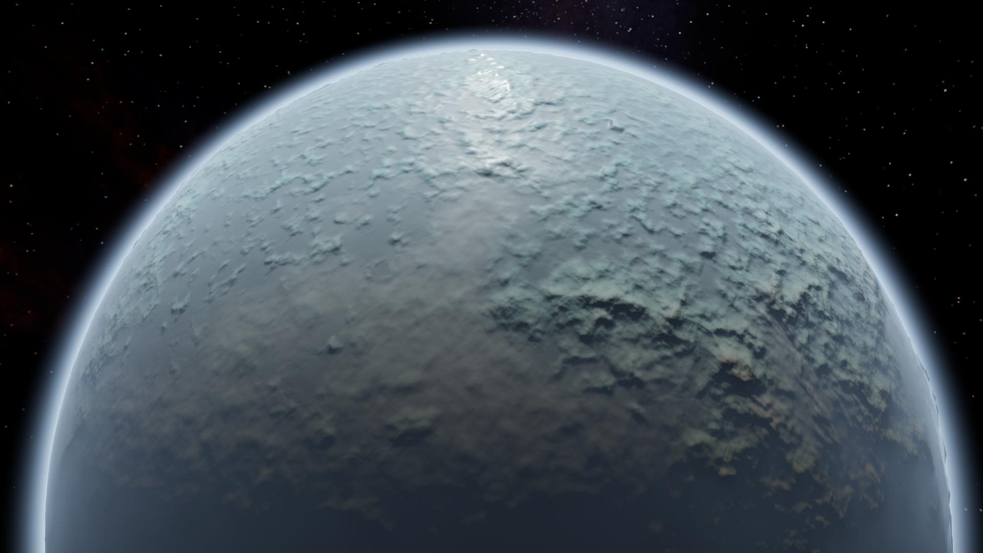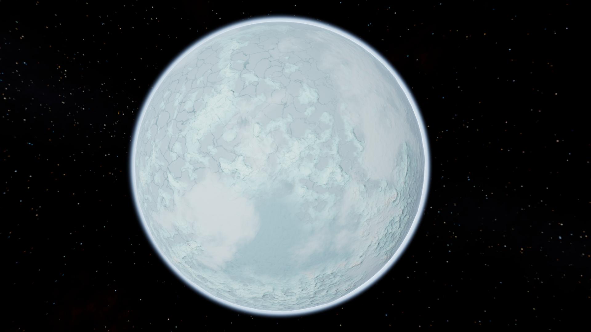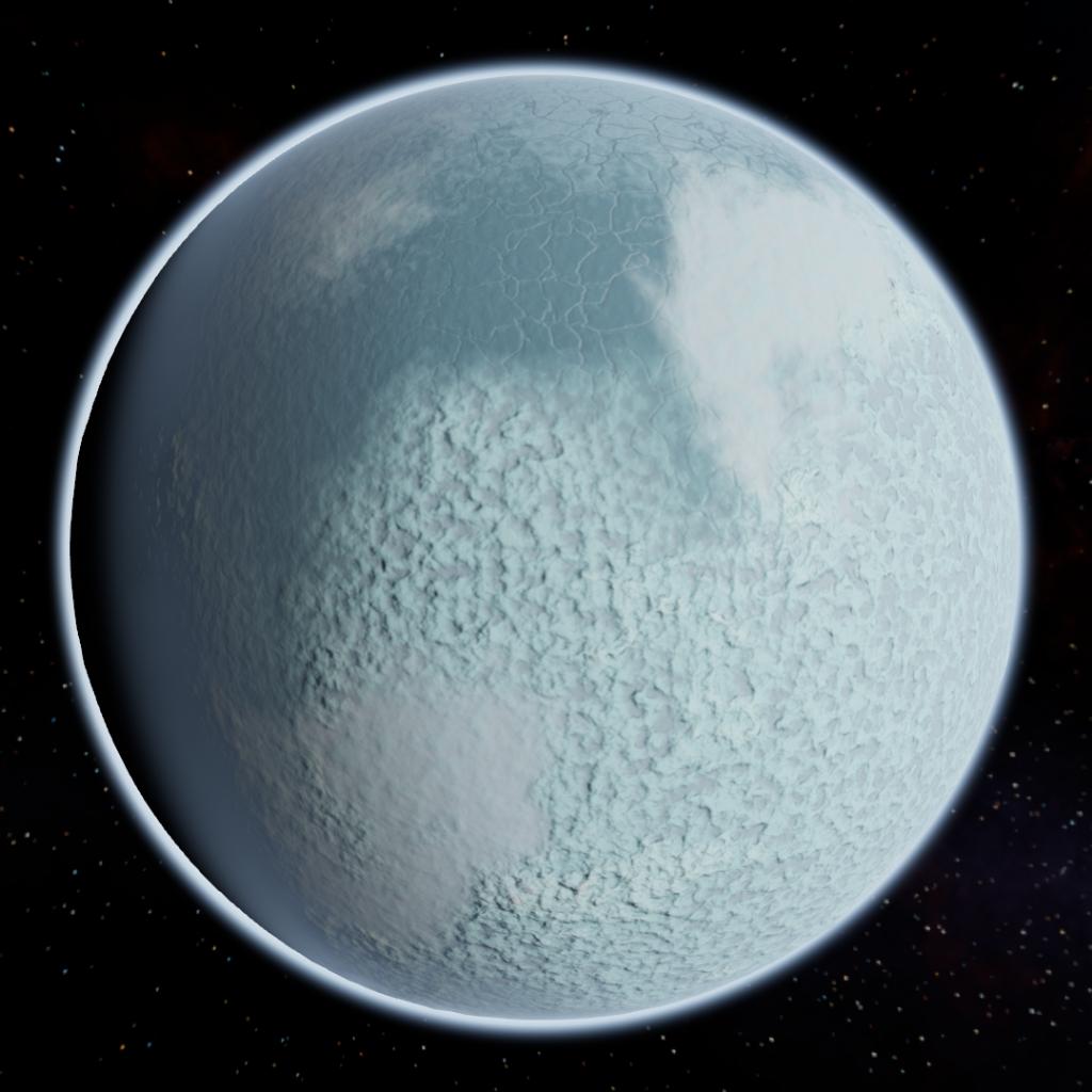 Ikrazit is an icy world with a moderate, if somewhat thin atmosphere and surface that's covered in cracks and large mountainous region, both of which covers large portion of the planet's surface area, suggesting that it is very geologically active.