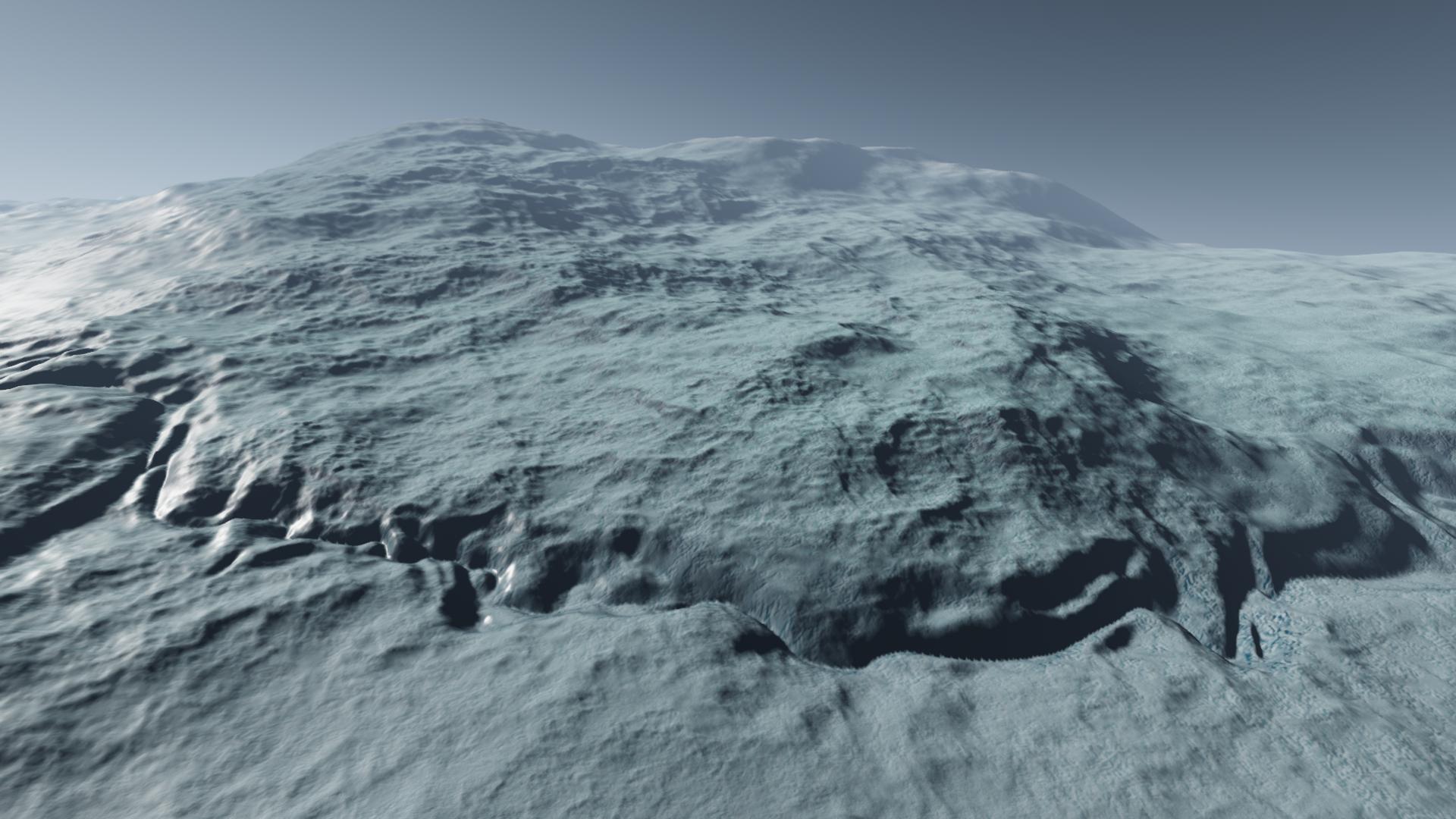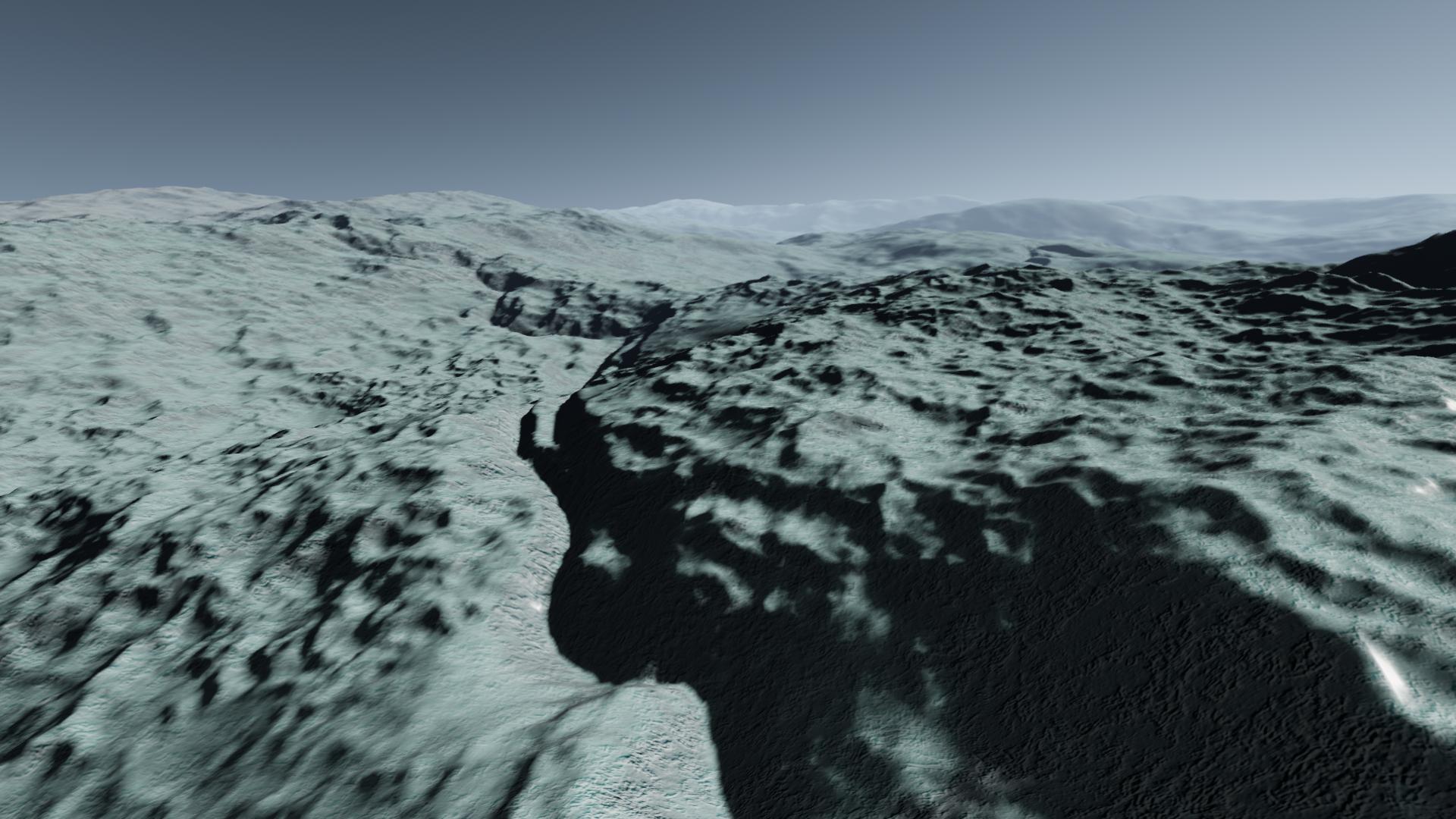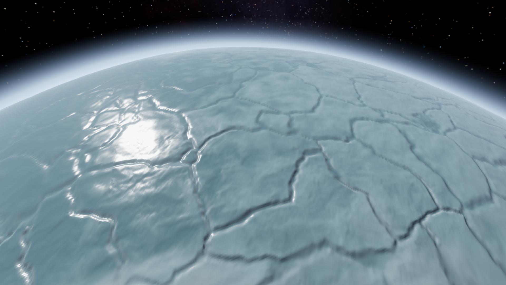 Ikrazit is an icy world with a moderate, if somewhat thin atmosphere and surface that's covered in cracks and large mountainous region, both of which covers large portion of the planet's surface area, suggesting that it is very geologically active.