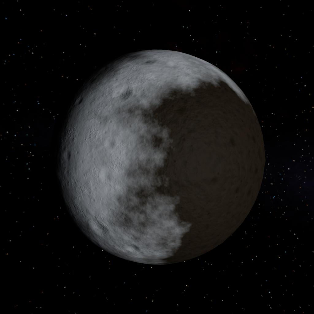 A rocky moon with an elevated ring around its equator and two clear regions surrounding its surface, one covered in ice and the other in naked rock. It has many craters in both regions, and overall a super bumpy surface.