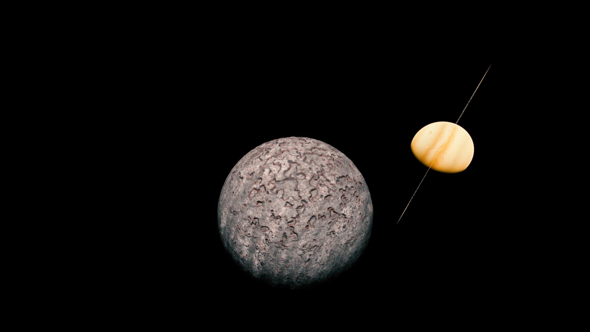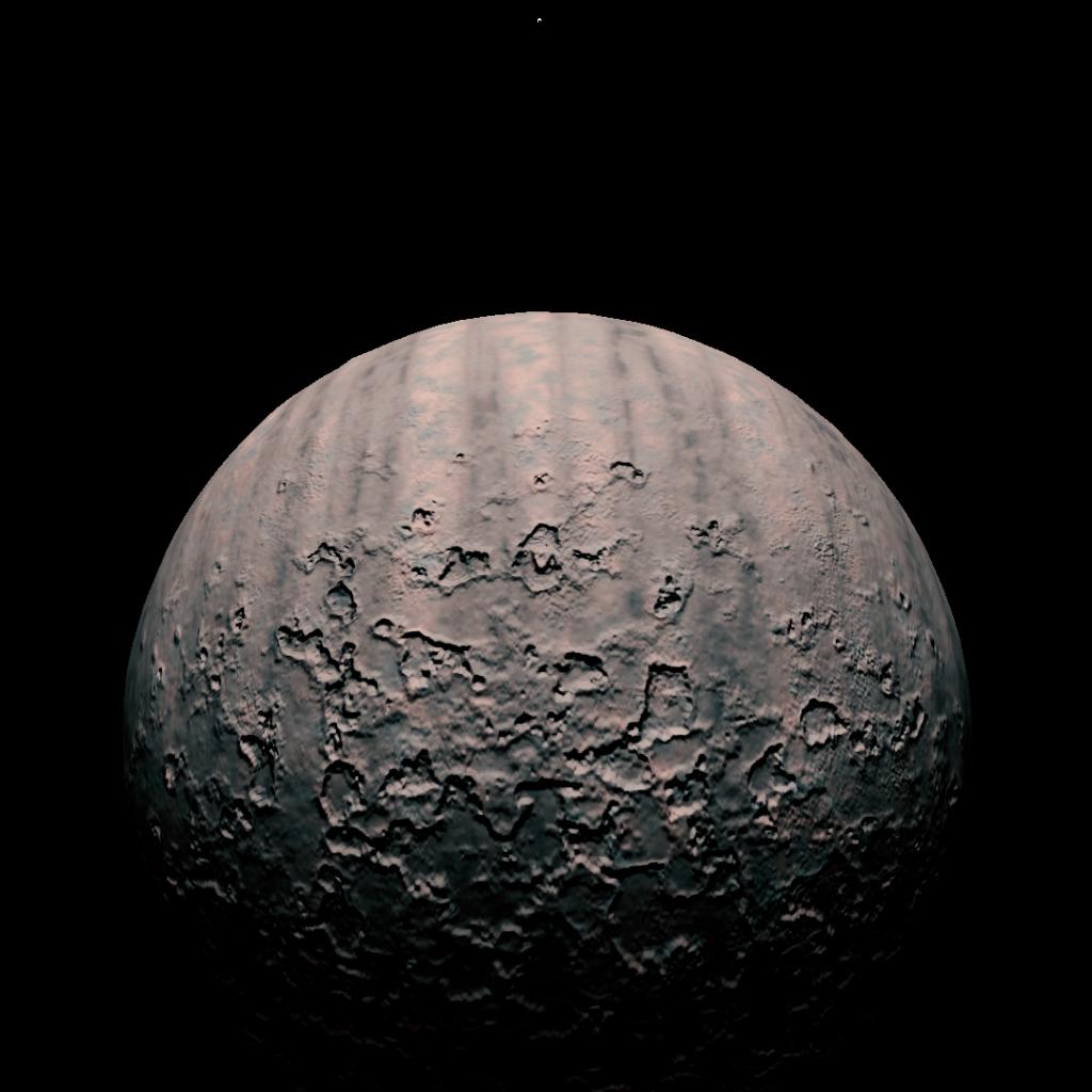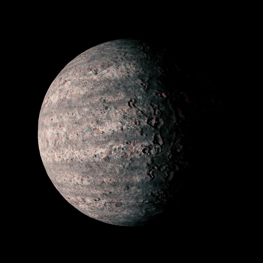 A very metallic tidally locked moon with intense canyons and scarring on one side, and deeper cratering and mountainous terrain on the other side.