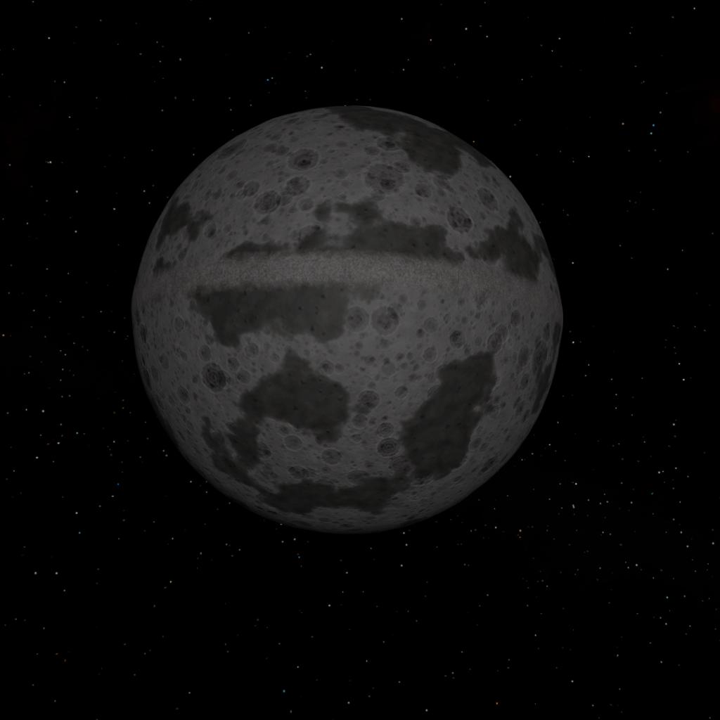 A small dark gray rocky moon with darker gray mara with some volcanoes and lighter gray highlands with many craters as well as an equatorial ridge from collecting some of Flourien's rings.