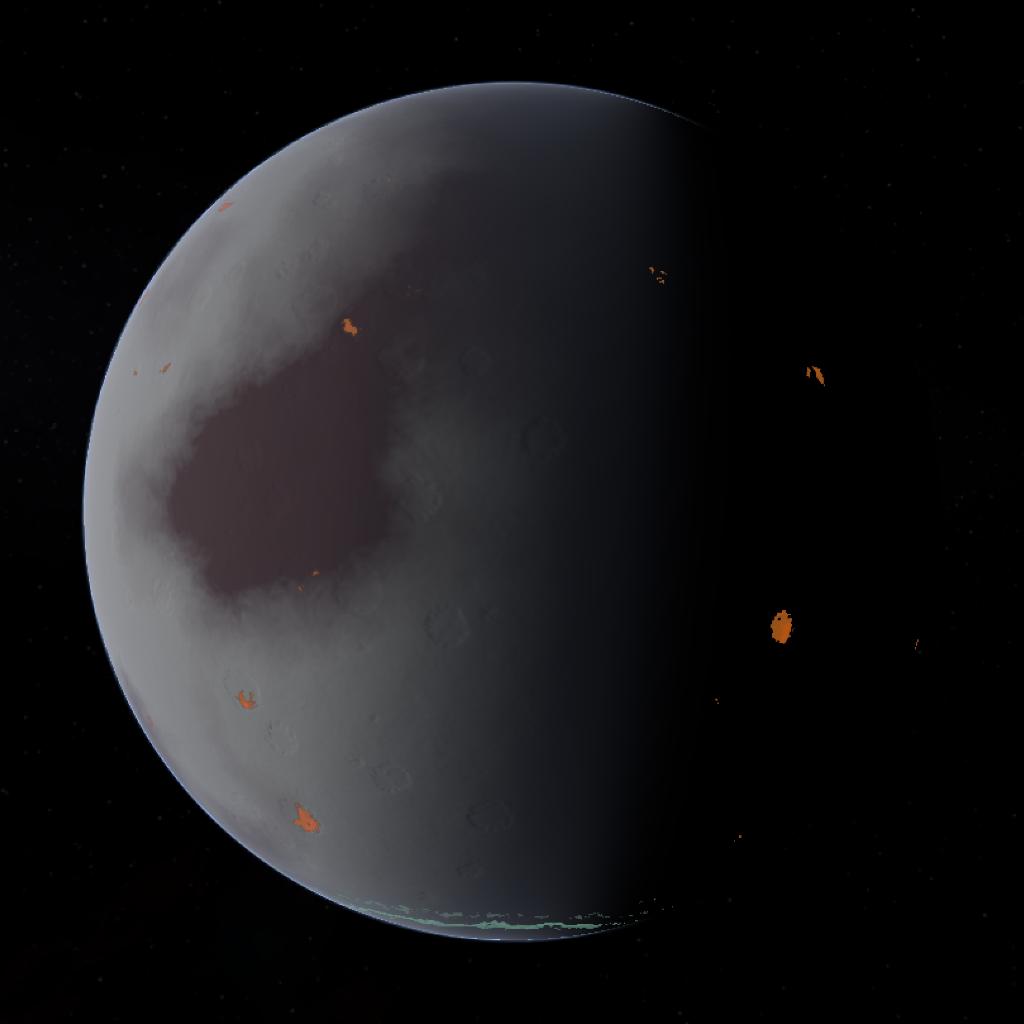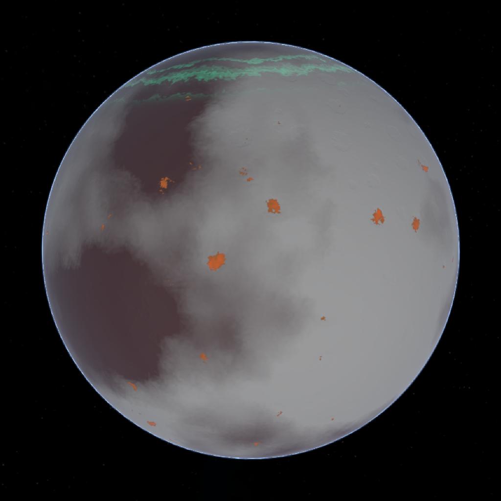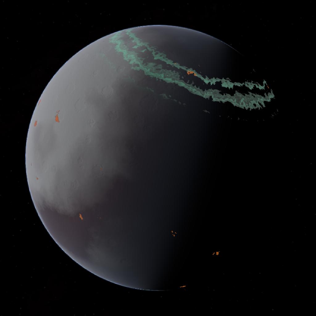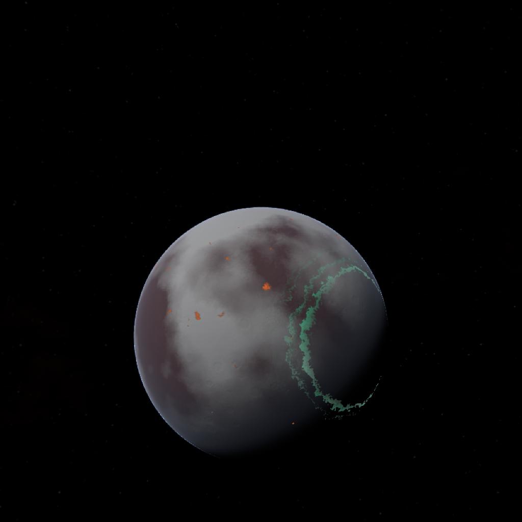 Elarea is the first moon of Glaceron, this moon is a medium sized moon covered in small but large volcanoes, the auroras present are faint because of the moon's weak magnetic field.