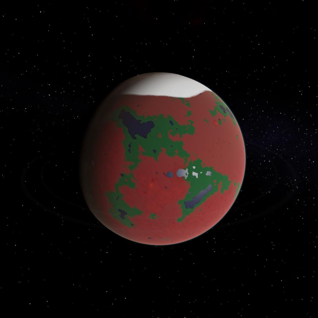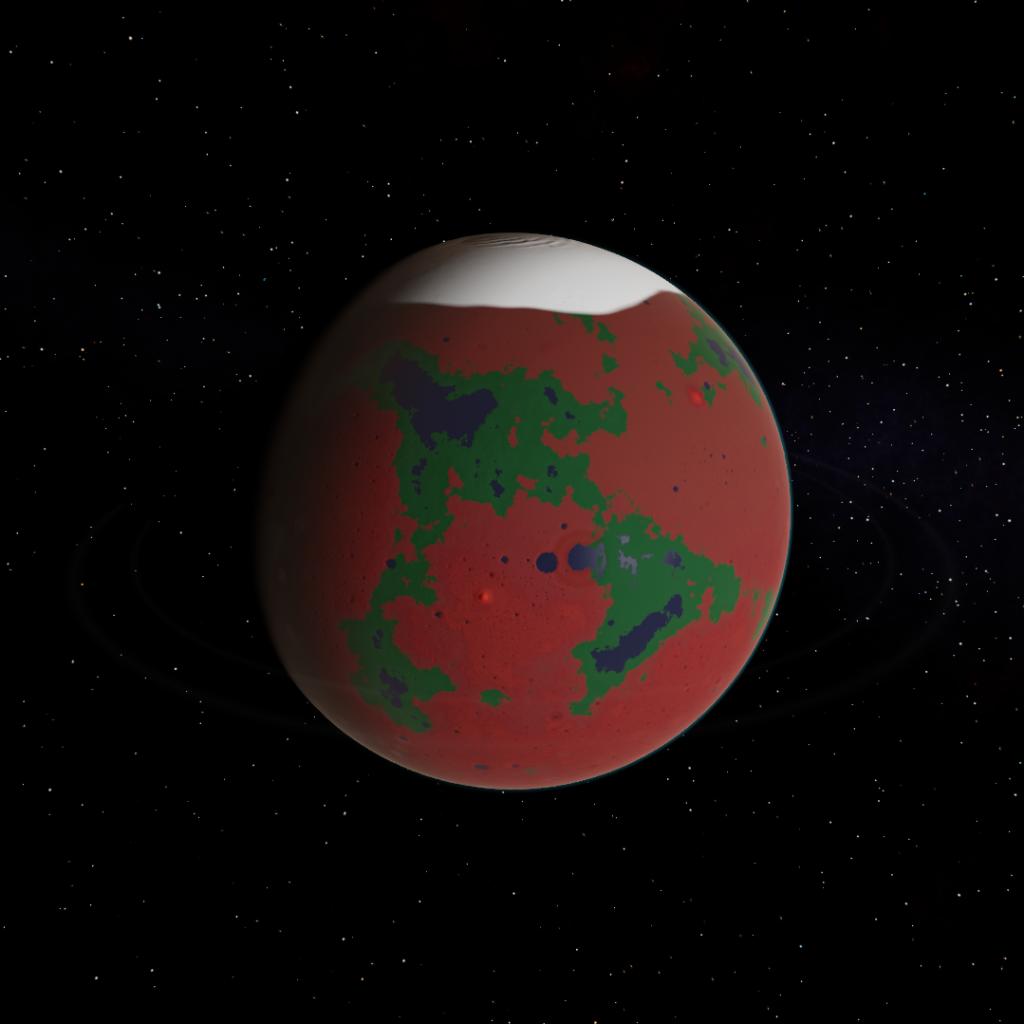 A large martian planet with many dust dunes and sandstorms. It is in the outer habitable zone of the Rintares System, and is partially habitable due to the rather high amount of nitrogen in its atmosphere, however all that's found for now is dirt and water. Many hills dot the surface. There are large pole sections near the top of the planet. Due to the likelyhood of habitabillity on this planet, a base for colinization, research, and terraforming has been constructed here. An extremely thin set of rings that is nearly impossible to see wraps around the planet, and scientists think that it formed because a former moon went inside the roche limit. Areas near the water lakes contain dirt, and areas away from the lakes consist of sand and raging winds. It has many craters that are also filled with water. The atmosphere has a cyan colored wavelength. It has one small moon with rare minerals that will be mined by the Frodius Foundation and PZL Agencies.