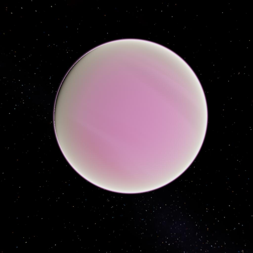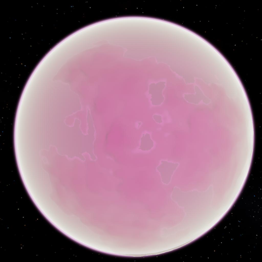 Canicone is one of its kind in the strings system, not because of its position bun because of it having liquid nitrogen as oceans, but this brigth pink color comes from iodine vapor on its atmosphere, with that said the surface is very rough because of iodine building up constantly, thoug its getting named was after a important female kitten scientist named Canicone