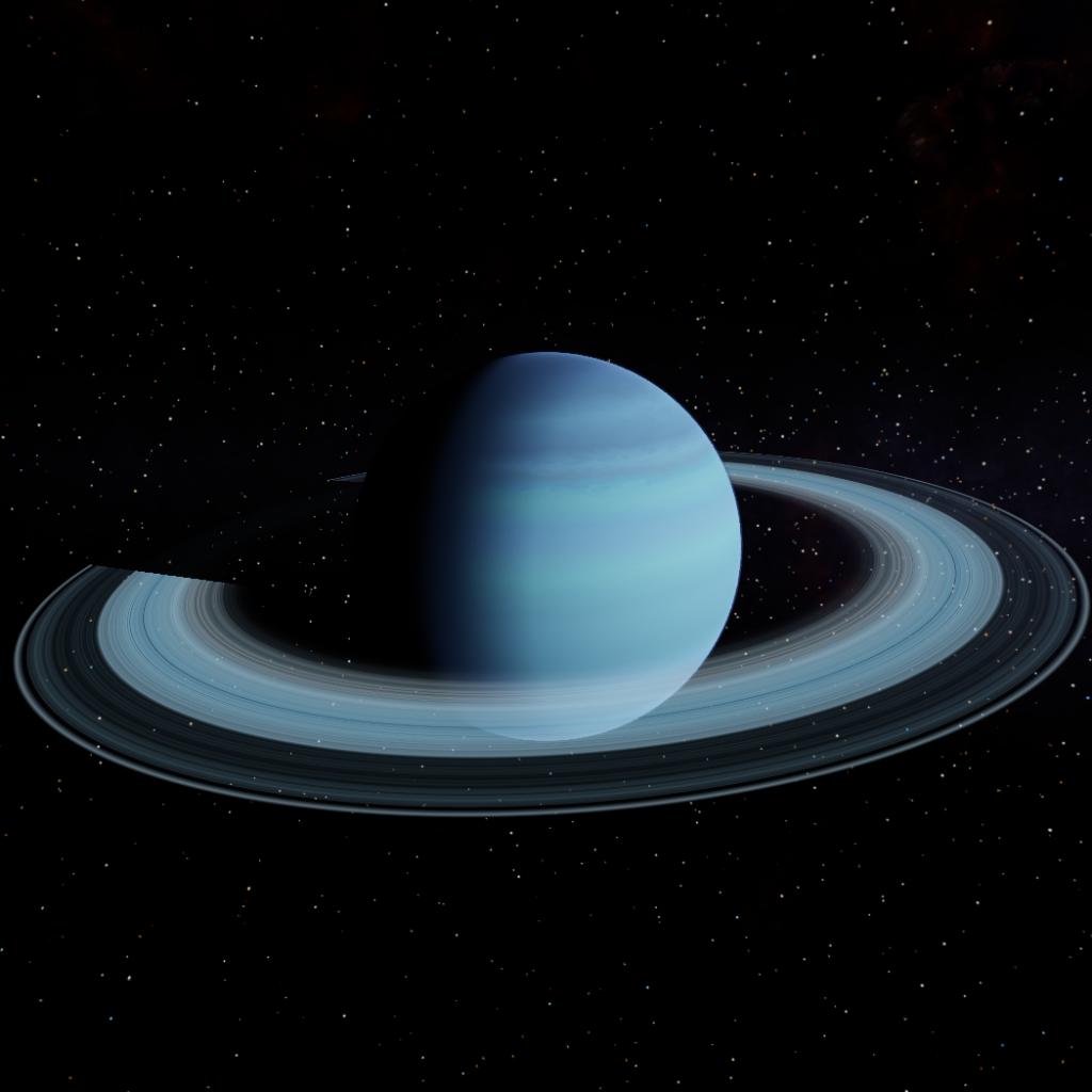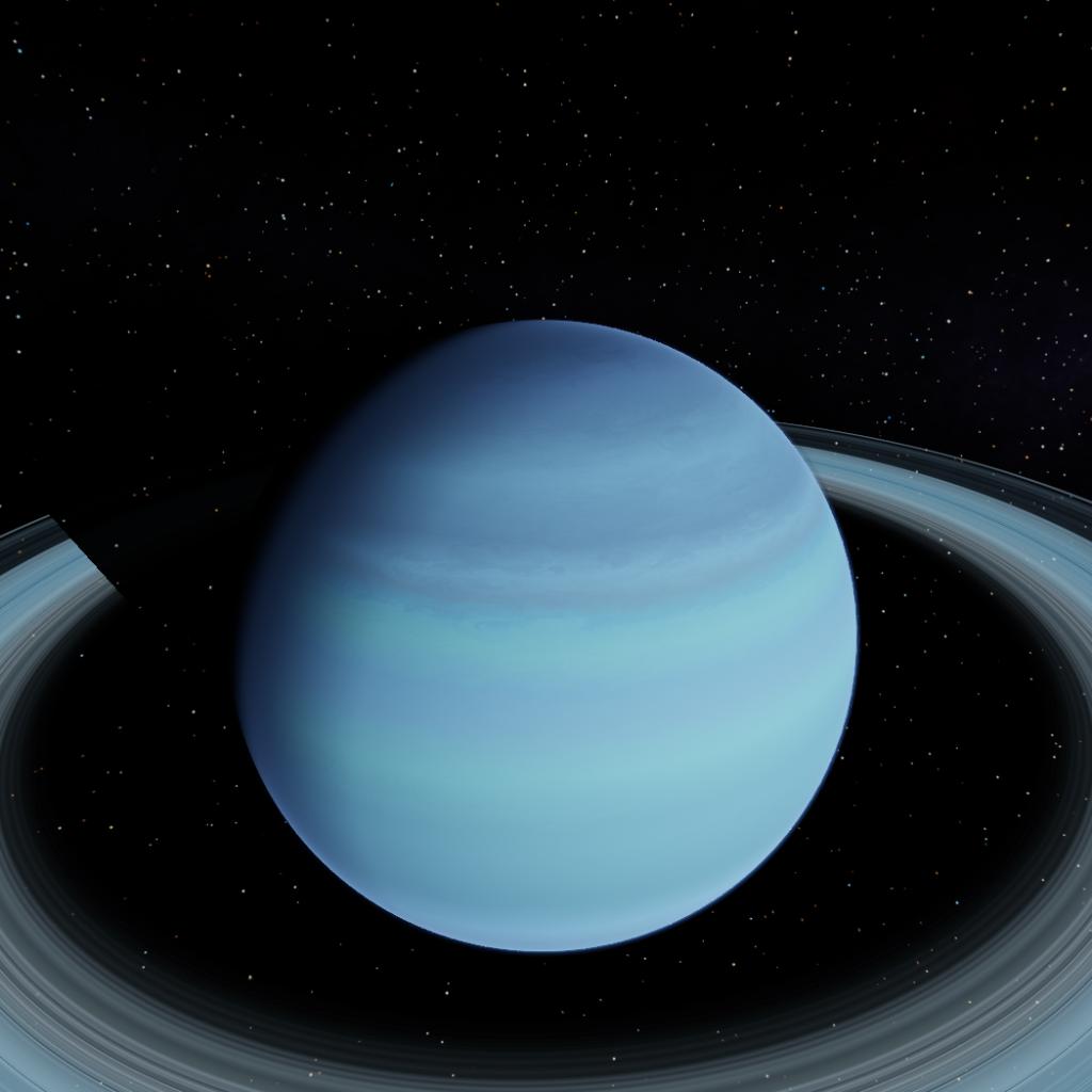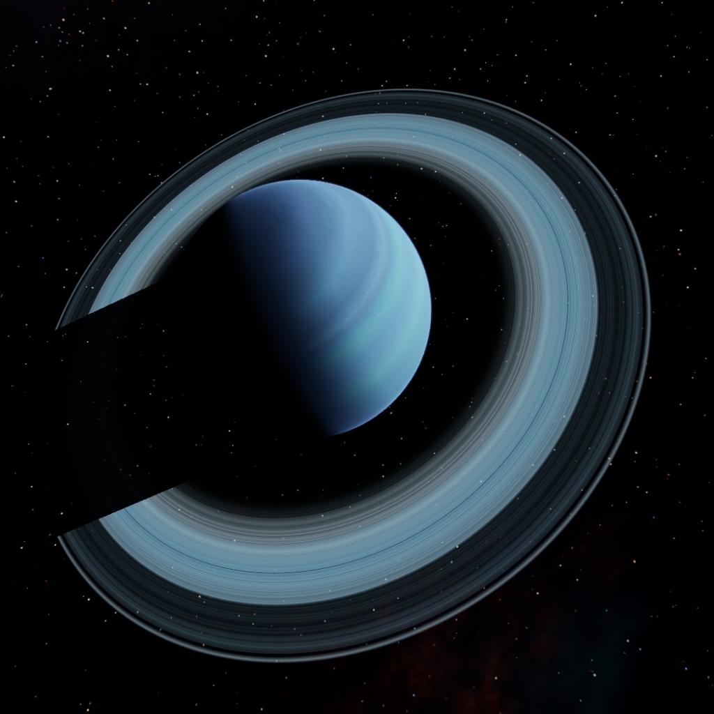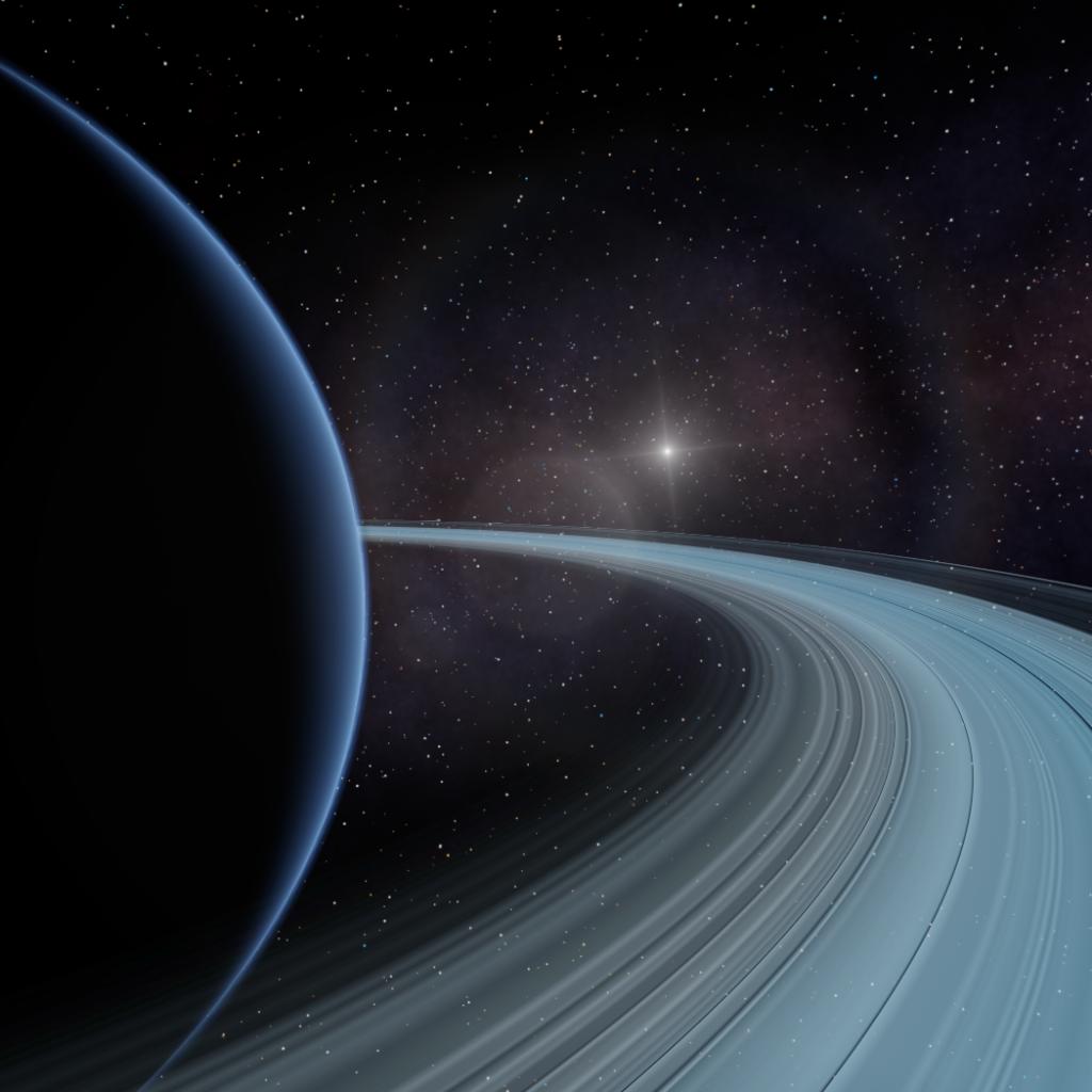 Encircling its equator is a vast, high-reflectivity ring system of fragmented water ice and silicates, which shimmer against the planet’s tranquil, light-blue backdrop under the influence of distant starlight.