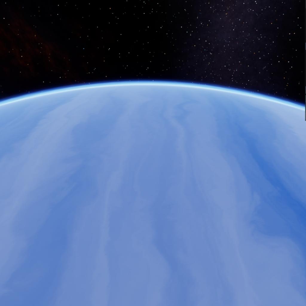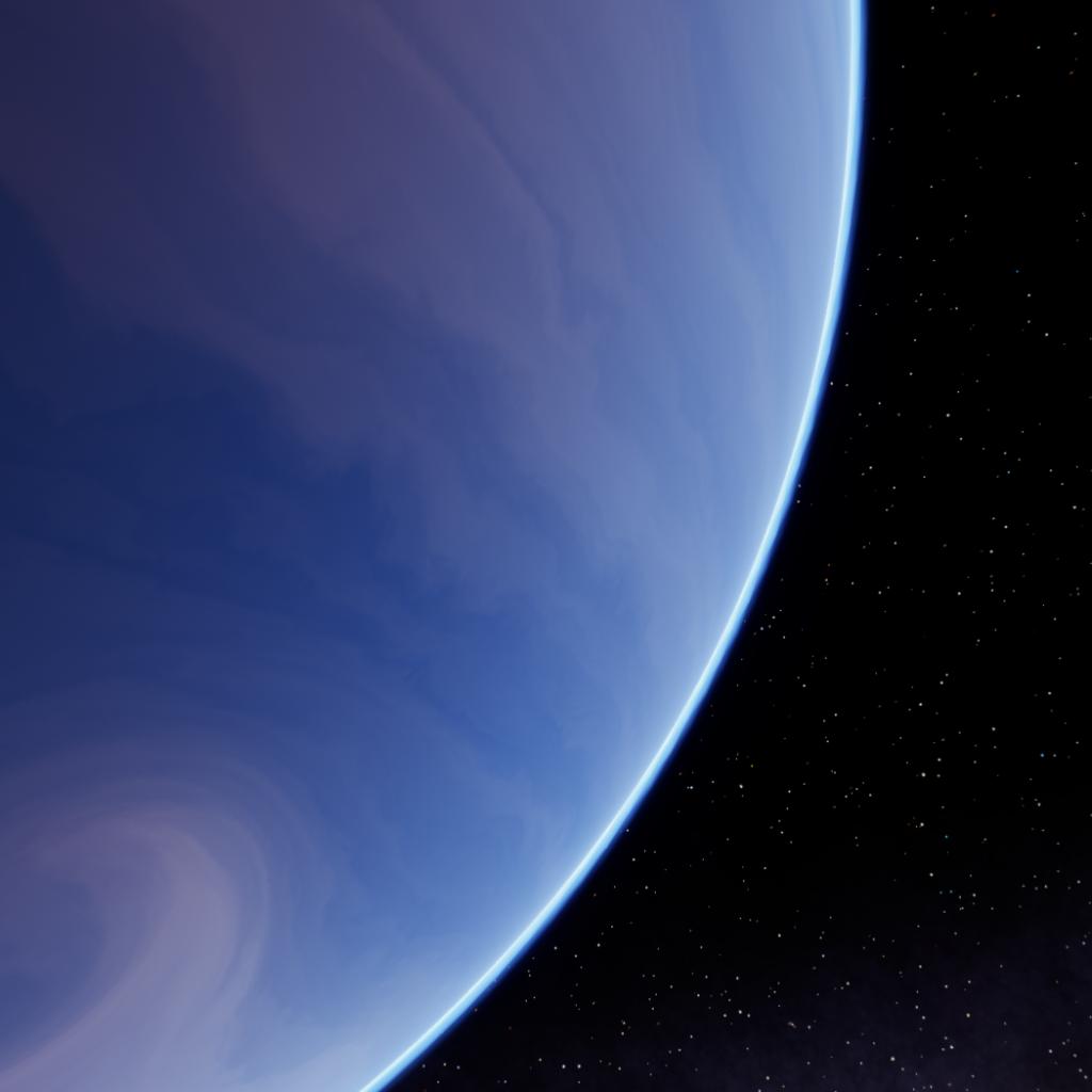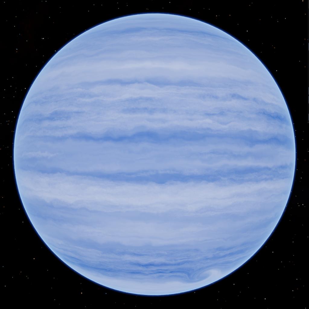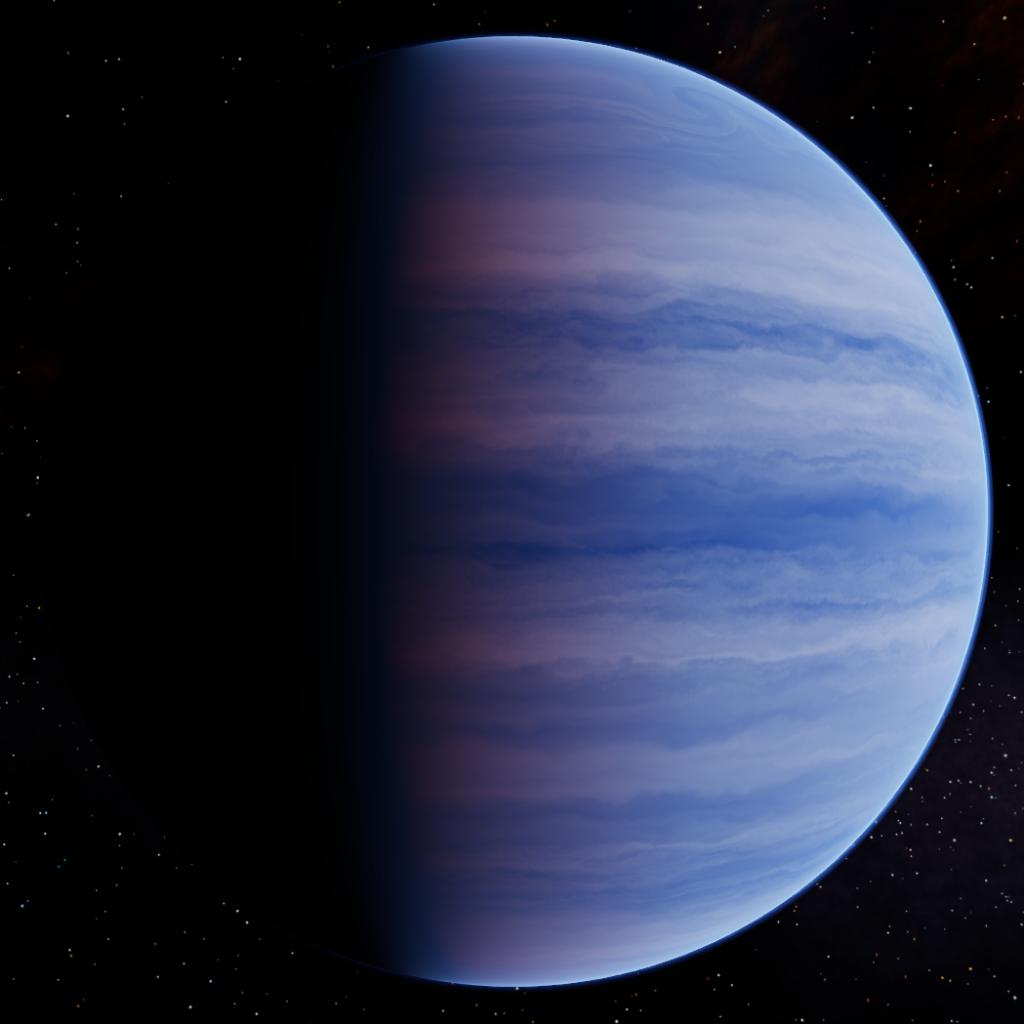 At 1.5 AU, this gas giant is defined by brilliant white bands of water-ice clouds, sculpted by high-velocity jet streams. Between these bright layers, the atmosphere reveals a deep, saturated azure hue. While intense solar UV radiation constantly dissociates methane in the upper layers, the resulting fragments sink into the planet’s scorching interior, where extreme heat and pressure reconstitute them. This recycled methane is then thrust back to the surface by powerful convection, where it acts as a spectral filter, absorbing red light to maintain the planet's dark, sapphire-colored depths.