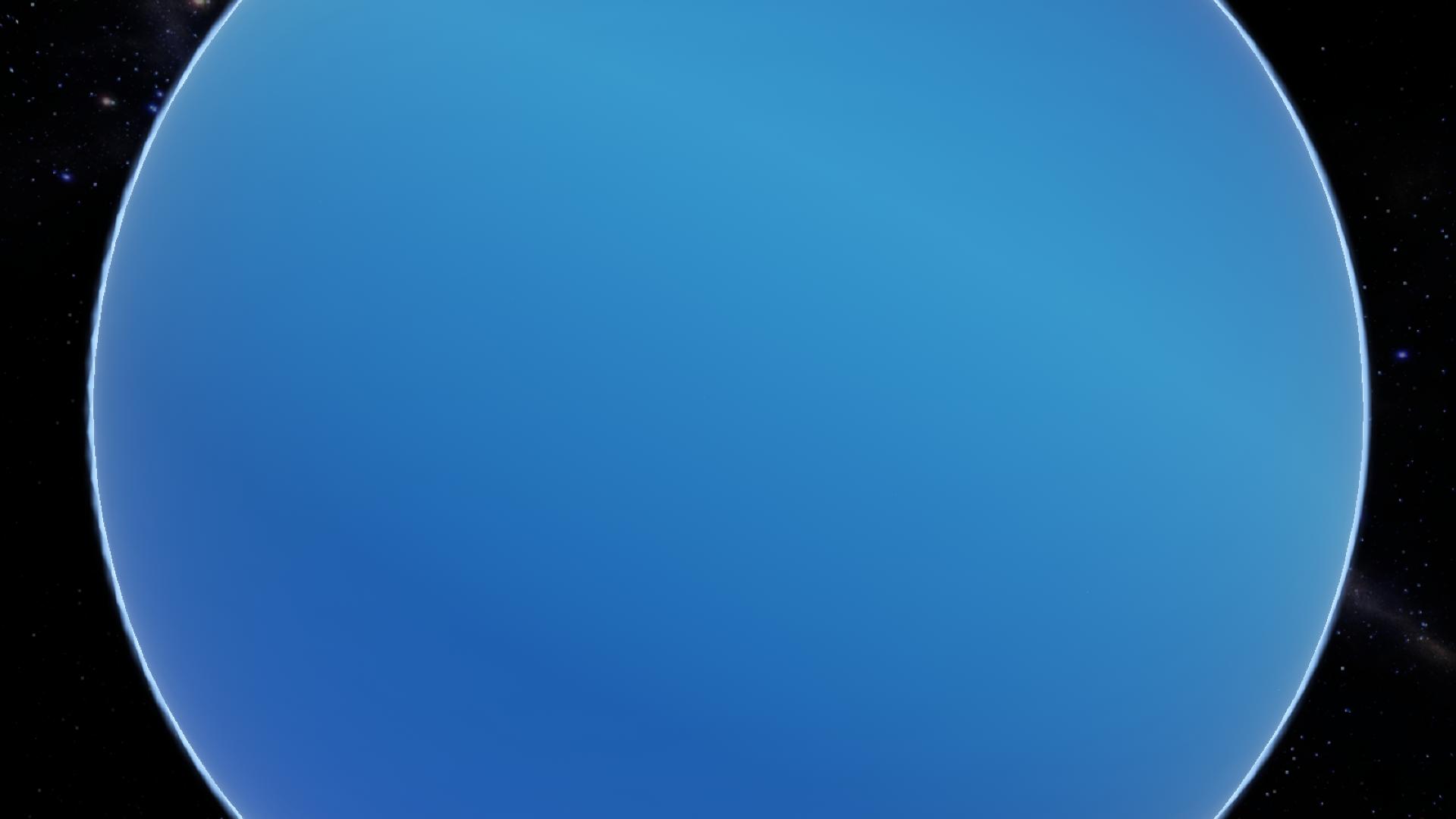 A tilted gas giant with smooth bands and a series of rings. Jno accurrate Neptune iwth 1/5th its actual scale