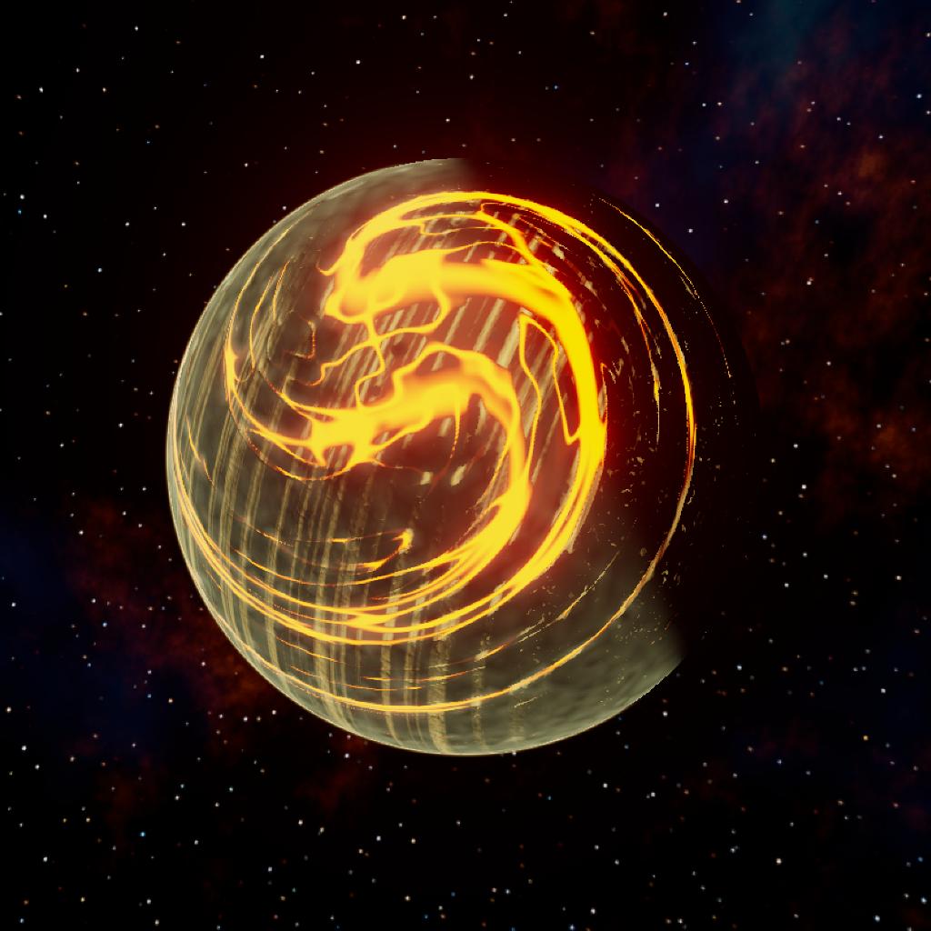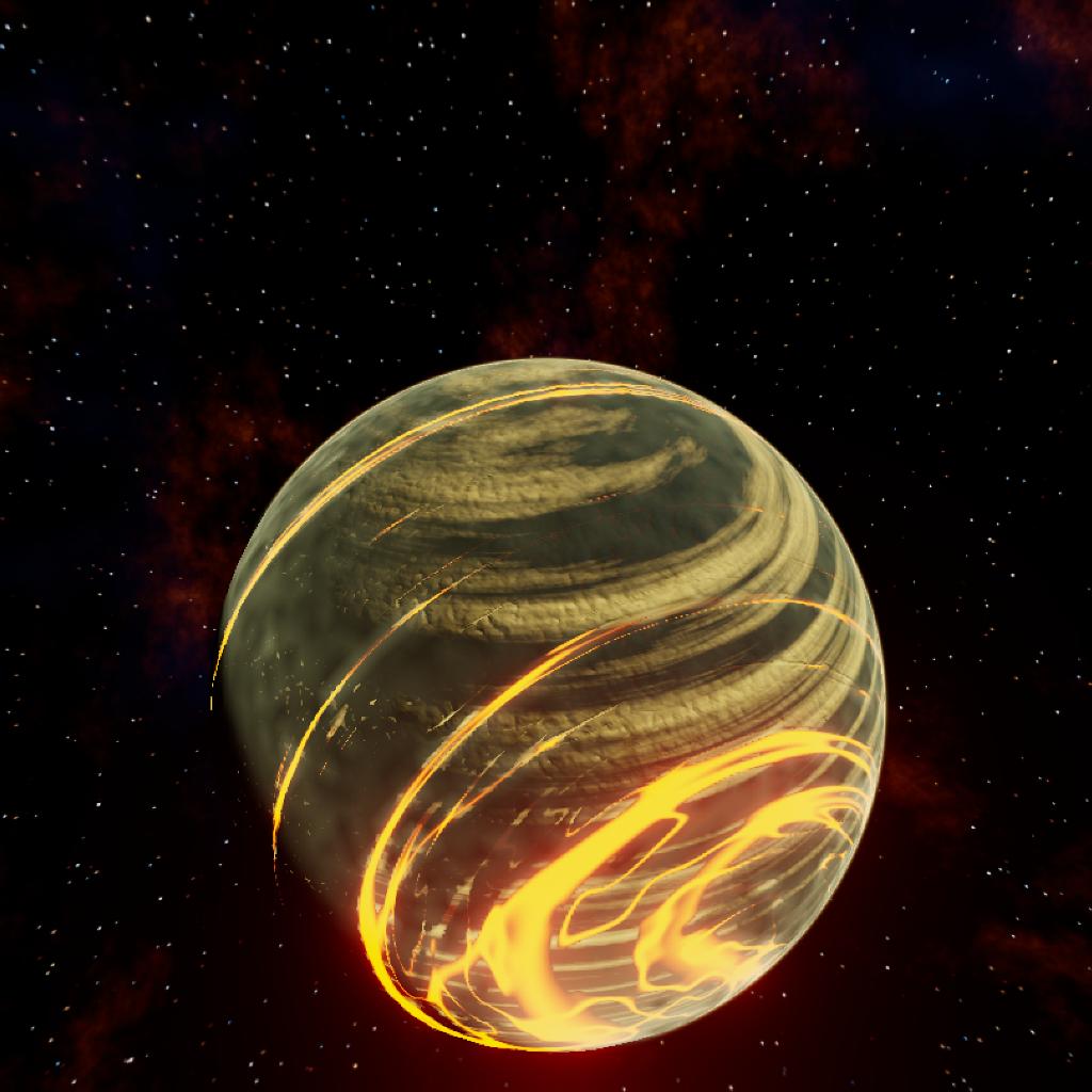 firts moon of D. It's magmatic clouds and atmosphere encircle the moon. With volcanoes erupting every day.