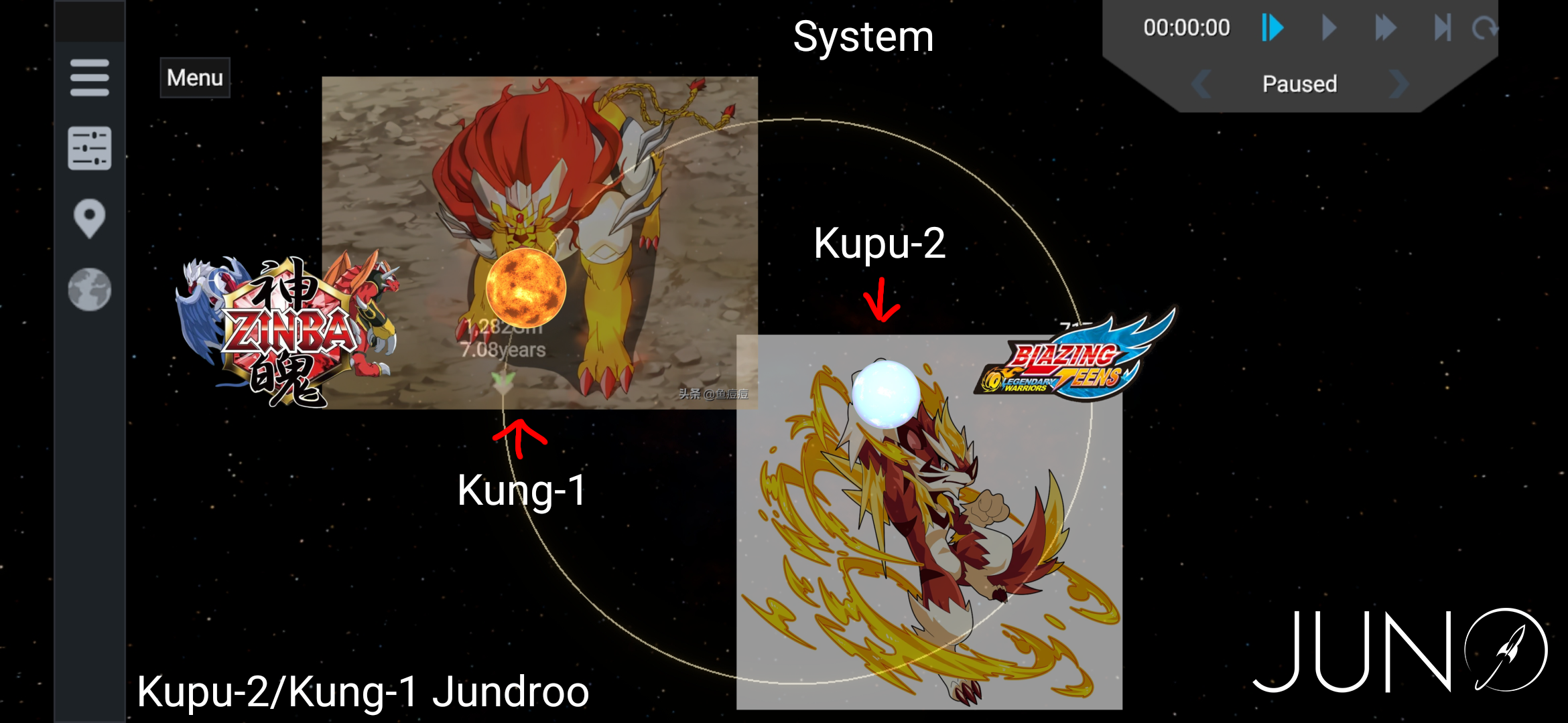 | Blazing Teens Warrior Legend Of Jundroo | Kupu-2 | 1,274 km | 9.8 m/s | 44,025.2 Mm | 39,130.6 Mm |