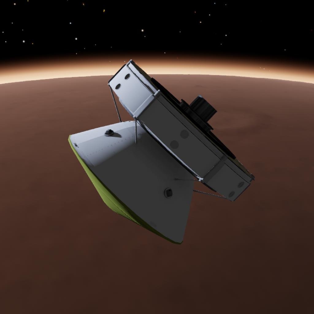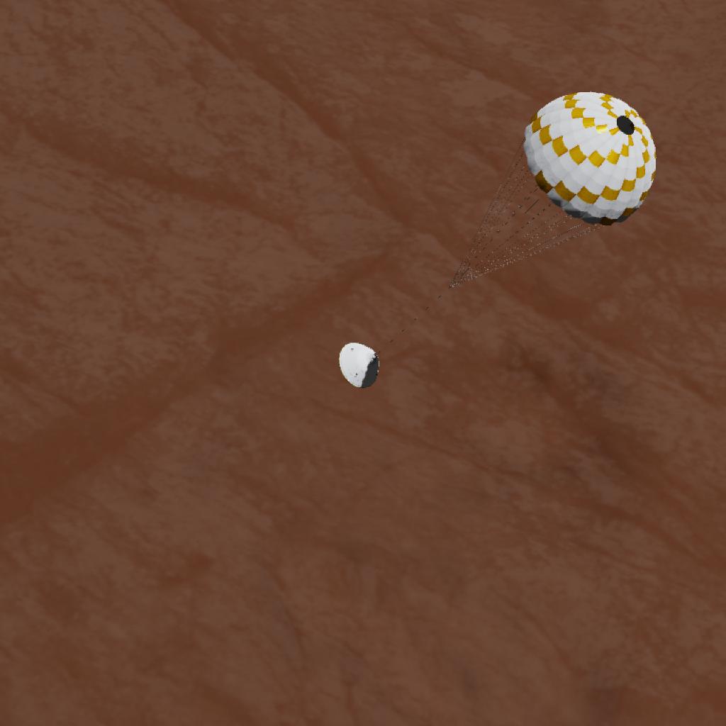 At around 13 km AGL, the parachute deploys and the heat shield separates. Then, at approximately 3000 m AGL, you can detach the sky crane, which carries the rover. You must carefully land it in a safe location (remember: fuel is not infinite).