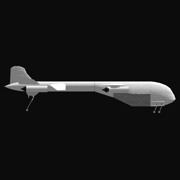 This aircraft is characterized by its tandem wing configuration and unconventional fuselage design. The forward and rear main wings can move forward or backward. The fuselage, which bulges significantly overall and tapers sharply toward the rear, was designed to accommodate a massive cargo bay forward and allow for external hardpoints aft.