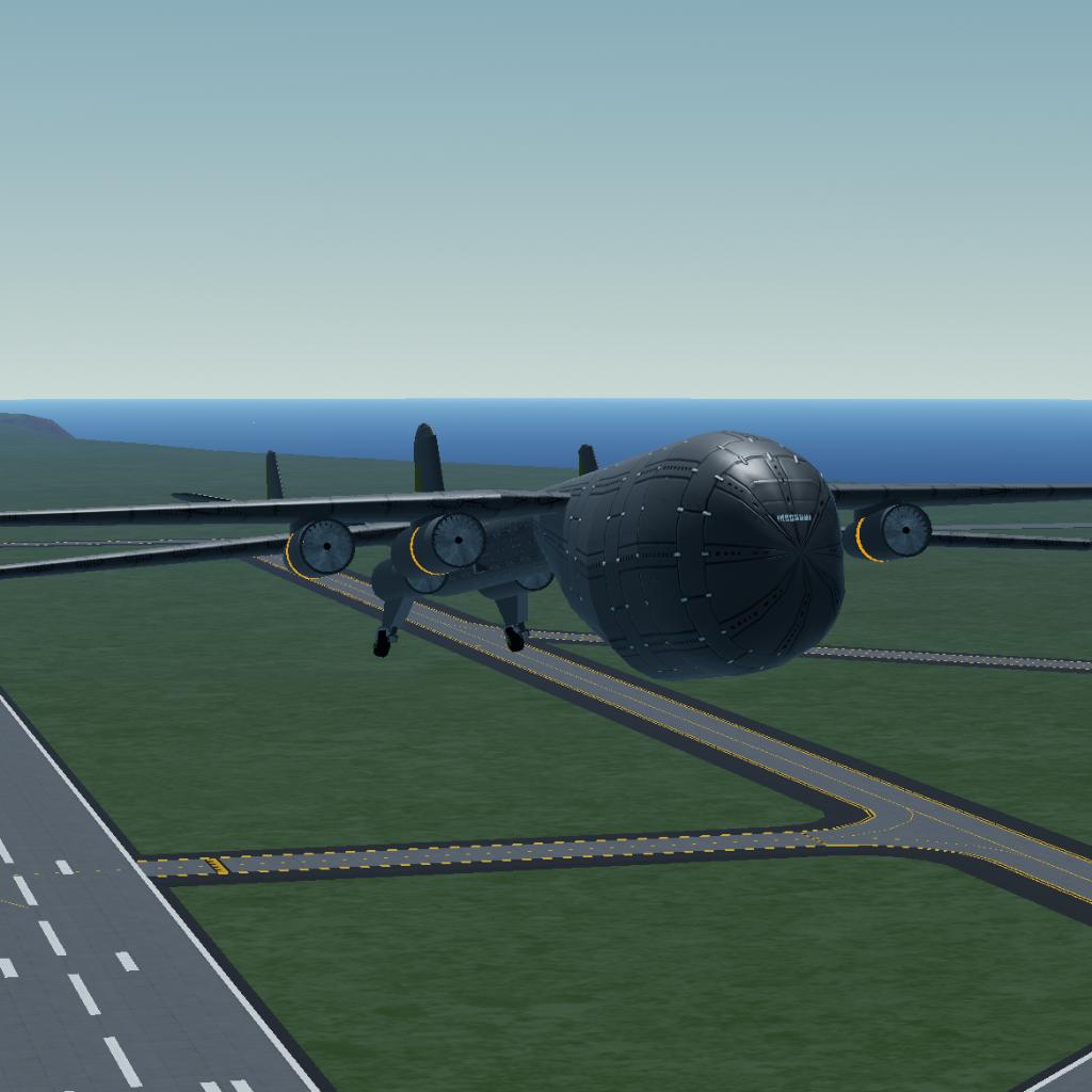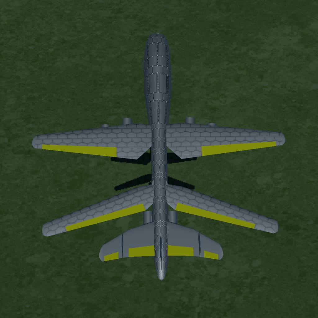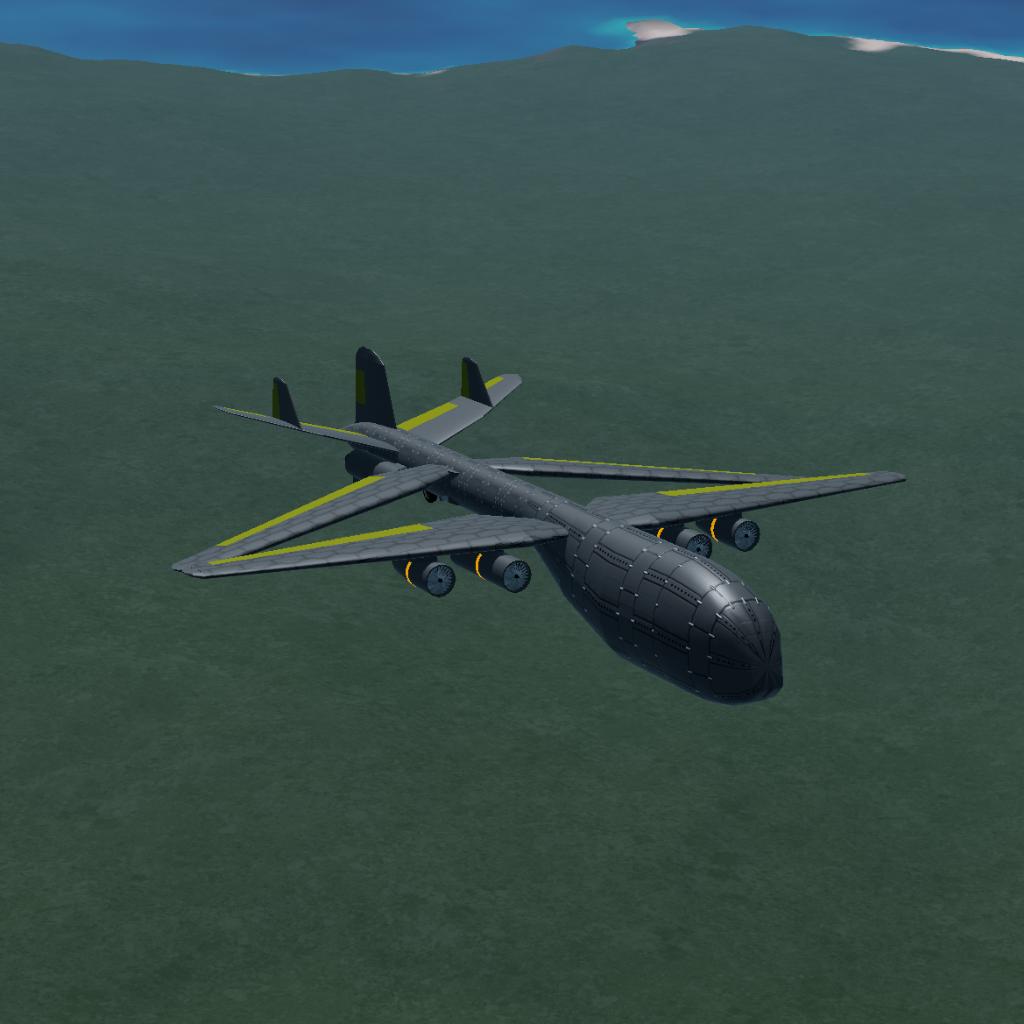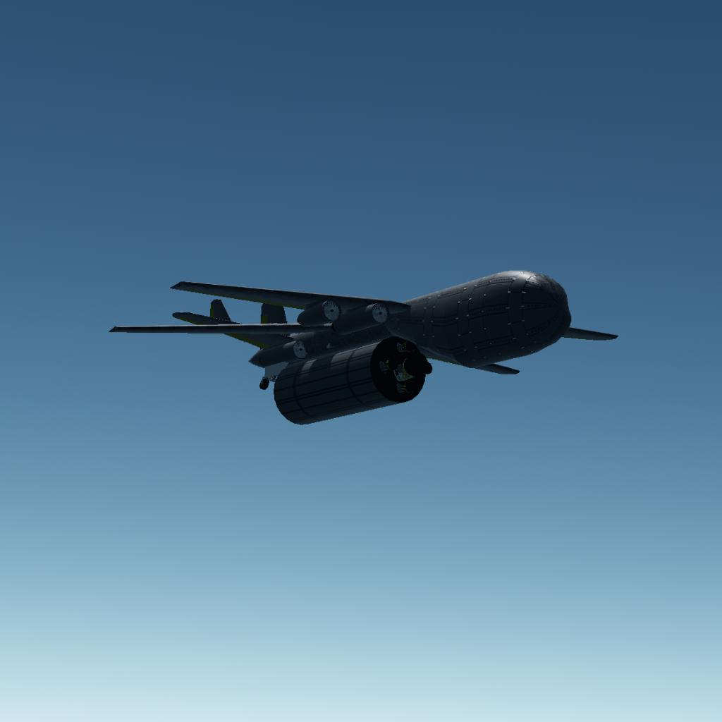 This is the first large aircraft I've created for this game. Early development plagued me with wings spinning wildly, followed by wings separating at light speed and flying off. Ultimately, though, I found a solution. I don't consider this model a success, but for me, the fact that this craft's design didn't fail is one of its successes. (Usually, when I build something huge, the design ends up trash.)